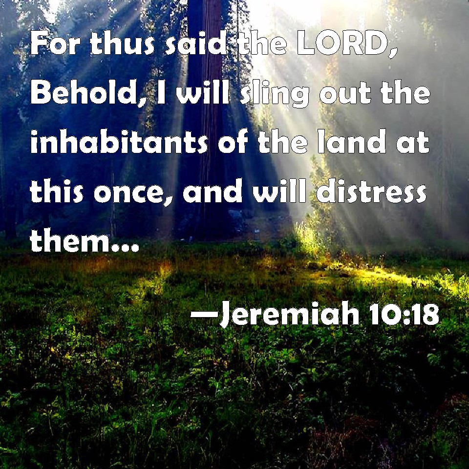 Choose a Background Jeremiah 10:18 For thus said the LORD, Behold, I will sling out the inhabitants of the land at this once, and will distress them, that they may find it so. KJV: For thus saith the LORD, Behold, I will sling out the inhabitants of the land at this once, and will distress them, that they may find it so. DRB: For thus saith the Lord: Behold I will cast away far off the inhabitants of the land at this time: and I will afflict them, so that they may be found. DBT: For thus saith Jehovah: Behold, I will this time sling out the inhabitants of the land, and will distress them, that they may be found. ERV: For thus saith the LORD, Behold, I will sling out the inhabitants of the land at this time, and will distress them, that they may feel it. WBT: For thus saith the LORD; Behold, I will sling out the inhabitants of the land at this once, and will distress them that they may find it so. WEB: For thus says Yahweh, Behold, I will sling out the inhabitants of the land at this time, and will distress them, that they may feel [it]. YLT: For thus said Jehovah: Lo, I am slinging out the inhabitants of the land at this time, And have been an adversary to them, So that they are found out.Links Jeremiah 10:18 NIV • Jeremiah 10:18 NLT • Jeremiah 10:18 ESV • Jeremiah 10:18 NASB • Jeremiah 10:18 KJV • Jeremiah 10:18 Interlinear • Jeremiah 10:18 Commentaries • Jeremiah 10:18 Parallel Texts • Jeremiah 10:18 Bible Apps • Jeremiah 10:18 Parallel • Bible Hub |