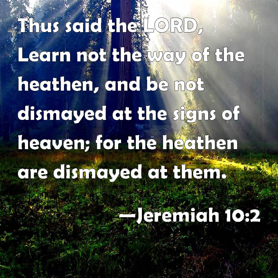 Choose a Background Jeremiah 10:2 Thus said the LORD, Learn not the way of the heathen, and be not dismayed at the signs of heaven; for the heathen are dismayed at them. KJV: Thus saith the LORD, Learn not the way of the heathen, and be not dismayed at the signs of heaven; for the heathen are dismayed at them. DRB: Thus saith the Lord: Learn not according to the ways of the Gentiles: and be not afraid of the signs of heaven, which the heathens fear: DBT: Thus saith Jehovah: Learn not the way of the nations, and be not dismayed at the signs of the heavens; for the nations are dismayed at them. ERV: thus saith the LORD, Learn not the way of the nations, and be not dismayed at the signs of heaven; for the nations are dismayed at them. WBT: Thus saith the LORD, Learn not the way of the heathen, and be not dismayed at the signs of heaven; for the heathen are dismayed at them. WEB: Thus says Yahweh, "Don't learn the way of the nations, and don't be dismayed at the signs of the sky; for the nations are dismayed at them. YLT: Thus said Jehovah: Unto the way of the nations accustom not yourselves, And by the signs of the heavens be not affrighted, For the nations are affrighted by them.Links Jeremiah 10:2 NIV • Jeremiah 10:2 NLT • Jeremiah 10:2 ESV • Jeremiah 10:2 NASB • Jeremiah 10:2 KJV • Jeremiah 10:2 Interlinear • Jeremiah 10:2 Commentaries • Jeremiah 10:2 Parallel Texts • Jeremiah 10:2 Bible Apps • Jeremiah 10:2 Parallel • Bible Hub |
