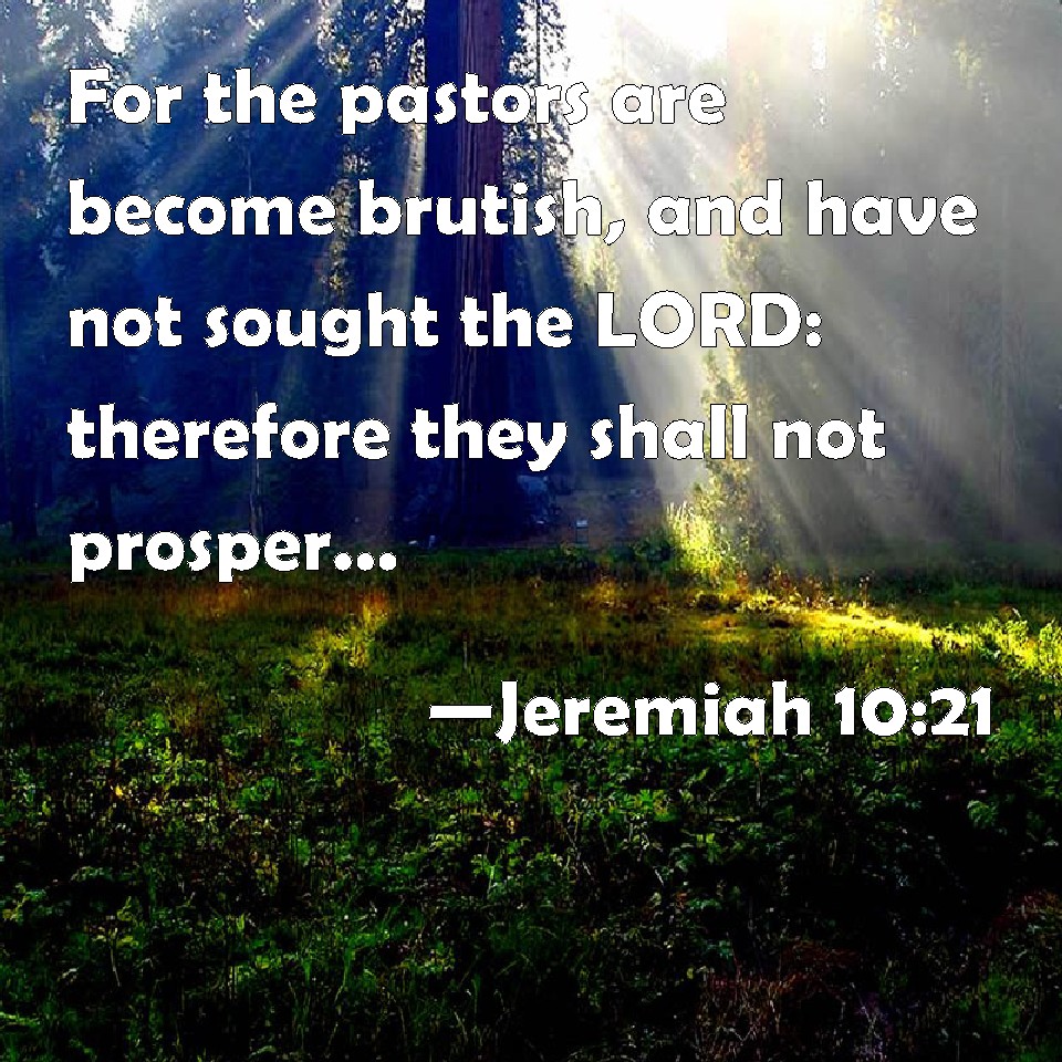 Choose a Background Jeremiah 10:21 For the pastors are become brutish, and have not sought the LORD: therefore they shall not prosper, and all their flocks shall be scattered. KJV: For the pastors are become brutish, and have not sought the LORD: therefore they shall not prosper, and all their flocks shall be scattered. DRB: Because the pastors have done foolishly, and have not sought the Lord: therefore have they not understood, and all their flock is scattered. DBT: For the shepherds are become brutish, and have not sought Jehovah; therefore have they not acted wisely, and all their flock is scattered. ERV: For the shepherds are become brutish, and have not inquired of the LORD: therefore they have not prospered, and all their flocks are scattered. WBT: For the pastors have become brutish, and have not sought the LORD: therefore they shall not prosper, and all their flocks shall be scattered. WEB: For the shepherds are become brutish, and have not inquired of Yahweh: therefore they have not prospered, and all their flocks are scattered. YLT: For the shepherds have become brutish, And Jehovah they have not sought, Therefore they have not acted wisely, And all their flock is scattered.Links Jeremiah 10:21 NIV • Jeremiah 10:21 NLT • Jeremiah 10:21 ESV • Jeremiah 10:21 NASB • Jeremiah 10:21 KJV • Jeremiah 10:21 Interlinear • Jeremiah 10:21 Commentaries • Jeremiah 10:21 Parallel Texts • Jeremiah 10:21 Bible Apps • Jeremiah 10:21 Parallel • Bible Hub |
