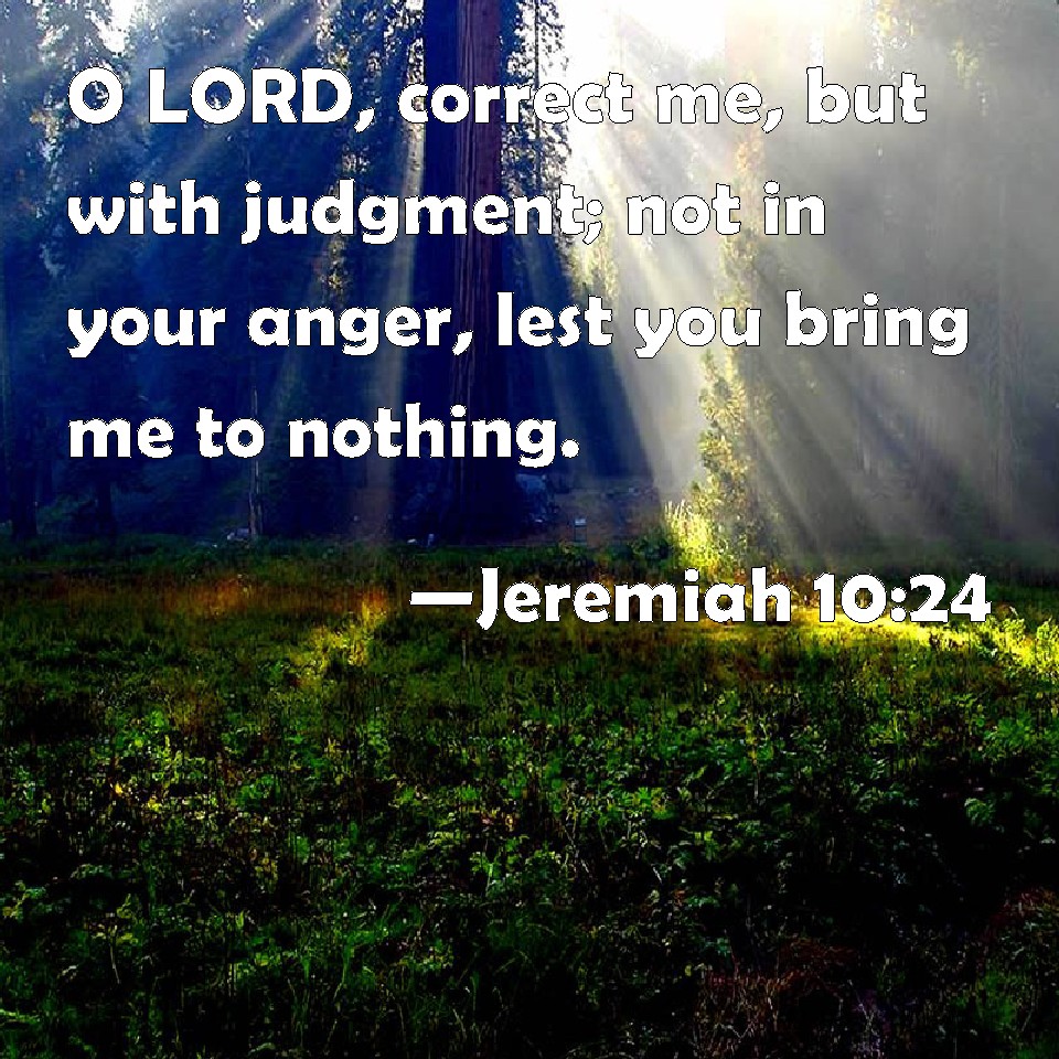 Choose a Background Jeremiah 10:24 O LORD, correct me, but with judgment; not in your anger, lest you bring me to nothing. KJV: O LORD, correct me, but with judgment; not in thine anger, lest thou bring me to nothing. DRB: Correct me, O Lord, but yet with judgement: and not in fury, lest thou bring me to nothing. DBT: Jehovah, correct me, but with judgment; not in thine anger, lest thou bring me to nothing. ERV: O LORD, correct me, but with judgment; not in thine anger, lest thou bring me to nothing. WBT: O LORD, correct me, but with judgment; not in thy anger, lest thou bring me to nothing. WEB: Yahweh, correct me, but in measure: not in your anger, lest you bring me to nothing. YLT: Chastise me, O Jehovah, only in judgment, Not in Thine anger, lest Thou make me small.Links Jeremiah 10:24 NIV • Jeremiah 10:24 NLT • Jeremiah 10:24 ESV • Jeremiah 10:24 NASB • Jeremiah 10:24 KJV • Jeremiah 10:24 Interlinear • Jeremiah 10:24 Commentaries • Jeremiah 10:24 Parallel Texts • Jeremiah 10:24 Bible Apps • Jeremiah 10:24 Parallel • Bible Hub |