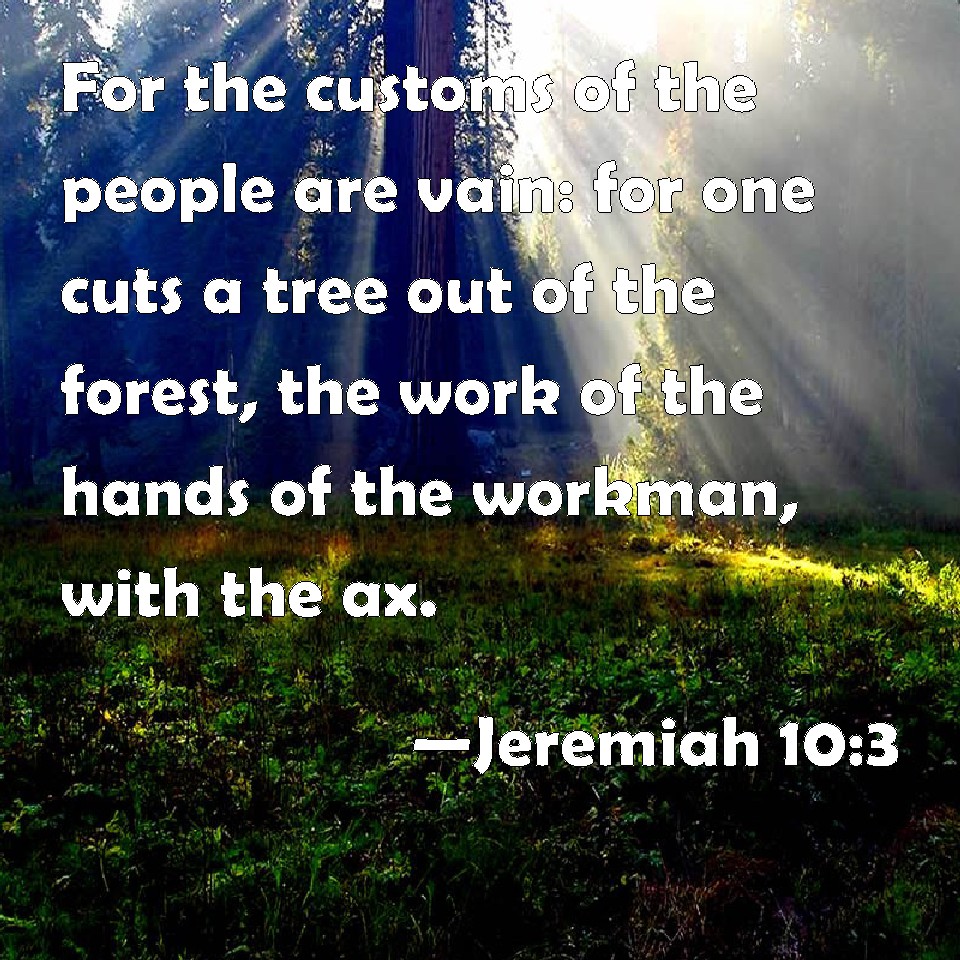 Choose a Background Jeremiah 10:3 For the customs of the people are vain: for one cuts a tree out of the forest, the work of the hands of the workman, with the ax. KJV: For the customs of the people are vain: for one cutteth a tree out of the forest, the work of the hands of the workman, with the axe. DRB: For the laws of the people are vain: for the works of the hand of the workman hath cut a tree out of the forest with an axe. DBT: For the statutes of the peoples are vanity; for it is a tree cut out of the forest, worked with a chisel by the hands of the artizan; ERV: For the customs of the peoples are vanity: for one cutteth a tree out of the forest, the work of the hands of the workman with the axe. WBT: For the customs of the people are vain: for one cutteth a tree out of the forest, the work of the hands of the workman, with the ax. WEB: For the customs of the peoples are vanity; for one cuts a tree out of the forest, the work of the hands of the workman with the axe. YLT: For the statutes of the peoples are vanity, For a tree from a forest hath one cut, Work of the hands of an artificer, with an axe,Links Jeremiah 10:3 NIV • Jeremiah 10:3 NLT • Jeremiah 10:3 ESV • Jeremiah 10:3 NASB • Jeremiah 10:3 KJV • Jeremiah 10:3 Interlinear • Jeremiah 10:3 Commentaries • Jeremiah 10:3 Parallel Texts • Jeremiah 10:3 Bible Apps • Jeremiah 10:3 Parallel • Bible Hub |