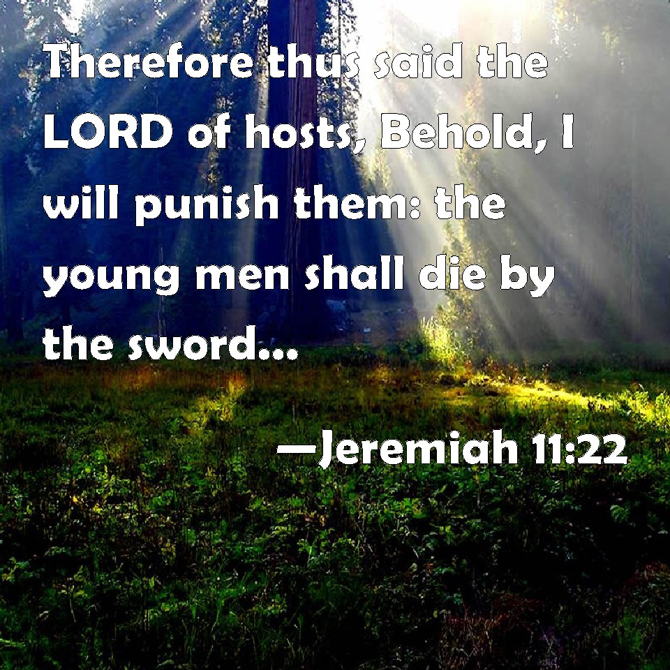 Choose a Background Jeremiah 11:22 Therefore thus said the LORD of hosts, Behold, I will punish them: the young men shall die by the sword; their sons and their daughters shall die by famine: KJV: Therefore thus saith the LORD of hosts, Behold, I will punish them: the young men shall die by the sword; their sons and their daughters shall die by famine: DRB: Therefore thus saith the Lord of hosts: Behold I will visit upon them: and their young men shall die by the sword, their sons and their daughters shall die by famine. DBT: therefore thus saith Jehovah of hosts: Behold, I punish them: the young men shall die by the sword; their sons and their daughters shall die by famine; ERV: therefore thus saith the LORD of hosts, Behold, I will punish them: the young men shall die by the sword; their sons and their daughters shall die by famine; WBT: Therefore thus saith the LORD of hosts, Behold, I will punish them: the young men shall die by the sword; their sons and their daughters shall die by famine: WEB: therefore thus says Yahweh of Armies, Behold, I will punish them: the young men shall die by the sword; their sons and their daughters shall die by famine; YLT: Therefore, thus said Jehovah of Hosts: 'Lo, I am seeing after them, The chosen ones die by sword, Their sons and their daughters die by famine,Links Jeremiah 11:22 NIV • Jeremiah 11:22 NLT • Jeremiah 11:22 ESV • Jeremiah 11:22 NASB • Jeremiah 11:22 KJV • Jeremiah 11:22 Interlinear • Jeremiah 11:22 Commentaries • Jeremiah 11:22 Parallel Texts • Jeremiah 11:22 Bible Apps • Jeremiah 11:22 Parallel • Bible Hub |