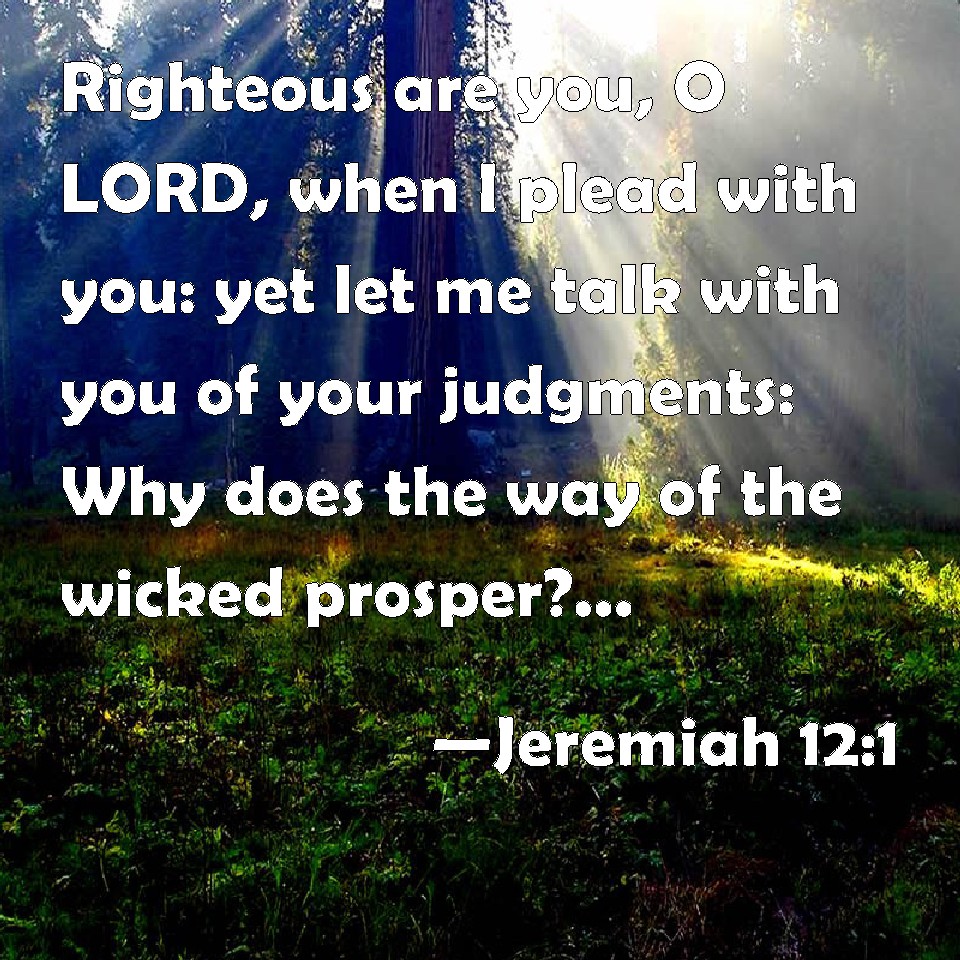 Choose a Background Jeremiah 12:1 Righteous are you, O LORD, when I plead with you: yet let me talk with you of your judgments: Why does the way of the wicked prosper? why are all they happy that deal very treacherously? KJV: Righteous art thou, O LORD, when I plead with thee: yet let me talk with thee of thy judgments: Wherefore doth the way of the wicked prosper? wherefore are all they happy that deal very treacherously? DRB: Thou indeed, O Lord, art just, if I plead with thee, but yet I will speak what is just to thee: Why doth the way of the wicked prosper: why is it well with all them that transgress, and do wickedly? DBT: Righteous art thou, Jehovah, when I plead with thee; yet will I speak with thee of thy judgments. Wherefore doth the way of the wicked prosper? wherefore are all they at ease that deal very treacherously? ERV: Righteous art thou, O LORD, when I plead with thee: yet would I reason the cause with thee: wherefore doth the way of the wicked prosper? wherefore are all they at ease that deal very treacherously? WBT: Righteous art thou, O LORD, when I plead with thee: yet let me speak with thee of thy judgments: Why doth the way of the wicked prosper? why are they all happy that deal very treacherously? WEB: You are righteous, Yahweh, when I contend with you; yet I would reason the cause with you: why does the way of the wicked prosper? why are all they at ease who deal very treacherously? YLT: Righteous art Thou, O Jehovah, When I plead towards thee, Only, judgments do I speak with Thee, Wherefore did the way of the wicked prosper? At rest have been all treacherous dealers.Links Jeremiah 12:1 NIV • Jeremiah 12:1 NLT • Jeremiah 12:1 ESV • Jeremiah 12:1 NASB • Jeremiah 12:1 KJV • Jeremiah 12:1 Interlinear • Jeremiah 12:1 Commentaries • Jeremiah 12:1 Parallel Texts • Jeremiah 12:1 Bible Apps • Jeremiah 12:1 Parallel • Bible Hub |