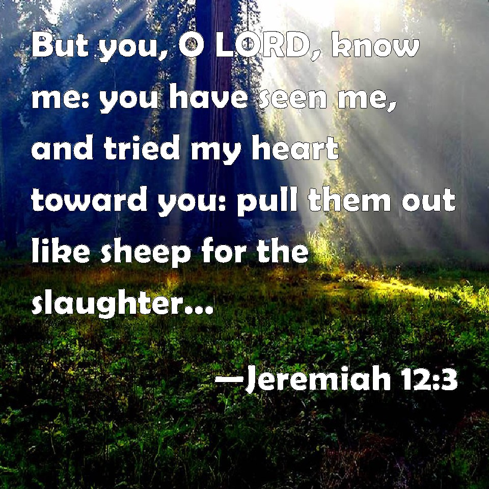 Choose a Background Jeremiah 12:3 But you, O LORD, know me: you have seen me, and tried my heart toward you: pull them out like sheep for the slaughter, and prepare them for the day of slaughter. KJV: But thou, O LORD, knowest me: thou hast seen me, and tried mine heart toward thee: pull them out like sheep for the slaughter, and prepare them for the day of slaughter. DRB: And thou, O Lord, hast known me, thou hast seen me, and proved my heart with thee: gather them together as sheep for a sacrifice, and prepare them for the day of slaughter. DBT: But thou, Jehovah, knowest me; thou hast seen me, and proved my heart toward thee. Drag them out like sheep for the slaughter, and set them apart for the day of slaughter. ERV: But thou, O LORD, knowest me; thou seest me, and triest mine heart toward thee: pull them out like sheep for the slaughter, and prepare them for the day of slaughter. WBT: But thou, O LORD, knowest me: thou hast seen me, and tried my heart towards thee: pull them out like sheep for the slaughter, and prepare them for the day of slaughter. WEB: But you, Yahweh, know me; you see me, and try my heart toward you: pull them out like sheep for the slaughter, and prepare them for the day of slaughter. YLT: And Thou, O Jehovah, Thou hast known me, Thou seest me, and hast tried my heart with Thee, Draw them away as sheep to slaughter, And separate them for a day of slaughter.Links Jeremiah 12:3 NIV • Jeremiah 12:3 NLT • Jeremiah 12:3 ESV • Jeremiah 12:3 NASB • Jeremiah 12:3 KJV • Jeremiah 12:3 Interlinear • Jeremiah 12:3 Commentaries • Jeremiah 12:3 Parallel Texts • Jeremiah 12:3 Bible Apps • Jeremiah 12:3 Parallel • Bible Hub |