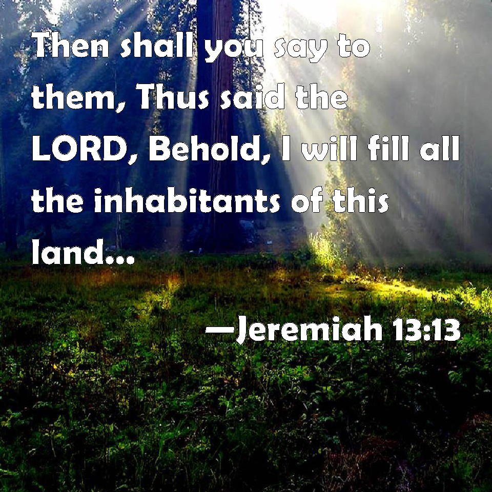 Choose a Background Jeremiah 13:13 Then shall you say to them, Thus said the LORD, Behold, I will fill all the inhabitants of this land, even the kings that sit on David's throne, and the priests, and the prophets, and all the inhabitants of Jerusalem, with drunkenness. KJV: Then shalt thou say unto them, Thus saith the LORD, Behold, I will fill all the inhabitants of this land, even the kings that sit upon David's throne, and the priests, and the prophets, and all the inhabitants of Jerusalem, with drunkenness. DRB: And thou shalt say to them: Thus saith the Lord: Behold I will fill all the inhabitants of this land, and the kings of the race of David that sit upon his throne, and the priests, and the prophets, and all the inhabitants of Jerusalem. with drunkenness. DBT: And thou shalt say unto them, Thus saith Jehovah: Behold, I will fill all the inhabitants of this land, and the kings that sit for David upon his throne, and the priests and the prophets, and all the inhabitants of Jerusalem, with drunkenness. ERV: Then shalt thou say unto them, Thus saith the LORD, Behold, I will fill all the inhabitants of this land, even the kings that sit upon David's throne, and the priests, and the prophets, and all the inhabitants of Jerusalem, with drunkenness. WBT: Then shalt thou say to them, Thus saith the LORD, Behold, I will fill all the inhabitants of this land, even the kings that sit upon David's throne, and the priests, and the prophets, and all the inhabitants of Jerusalem, with drunkenness. WEB: Then you shall tell them, Thus says Yahweh, Behold, I will fill all the inhabitants of this land, even the kings who sit on David's throne, and the priests, and the prophets, and all the inhabitants of Jerusalem, with drunkenness. YLT: And thou hast said unto them, 'Thus said Jehovah: Lo, I am filling all the inhabitants of this land, And the kings who sit for David on his throne, And the priests, and the prophets, And all the inhabitants of Jerusalem, With drunkenness,Links Jeremiah 13:13 NIV • Jeremiah 13:13 NLT • Jeremiah 13:13 ESV • Jeremiah 13:13 NASB • Jeremiah 13:13 KJV • Jeremiah 13:13 Interlinear • Jeremiah 13:13 Commentaries • Jeremiah 13:13 Parallel Texts • Jeremiah 13:13 Bible Apps • Jeremiah 13:13 Parallel • Bible Hub |