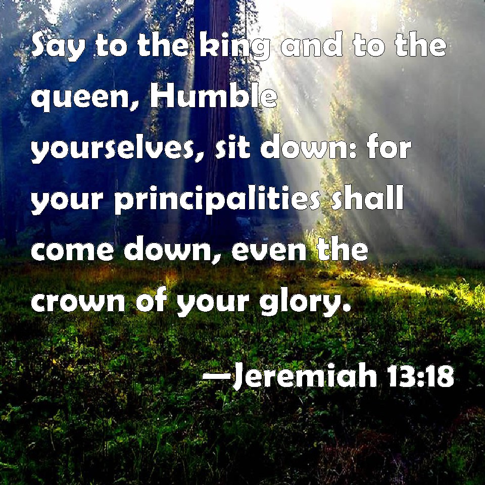 Choose a Background Jeremiah 13:18 Say to the king and to the queen, Humble yourselves, sit down: for your principalities shall come down, even the crown of your glory. KJV: Say unto the king and to the queen, Humble yourselves, sit down: for your principalities shall come down, even the crown of your glory. DRB: Say to the king, and to the queen: Humble yourselves, sit down: for the crown of your glory is come down from your head. DBT: Say unto the king and to the queen: Humble yourselves, sit down low; for from your heads shall come down the crown of your magnificence. ERV: Say thou unto the king and to the queen-mother, Humble yourselves, sit down: for your headtires are come down, even the crown of your glory. WBT: Say to the king and to the queen, Humble yourselves, sit down: for your principalities shall come down, even the crown of your glory. WEB: Say to the king and to the queen mother, Humble yourselves, sit down; for your headdresses have come down, even the crown of your glory. YLT: Say to the king and to the mistress: Make yourselves low — sit still, For come down have your principalities, The crown of your beauty.Links Jeremiah 13:18 NIV • Jeremiah 13:18 NLT • Jeremiah 13:18 ESV • Jeremiah 13:18 NASB • Jeremiah 13:18 KJV • Jeremiah 13:18 Interlinear • Jeremiah 13:18 Commentaries • Jeremiah 13:18 Parallel Texts • Jeremiah 13:18 Bible Apps • Jeremiah 13:18 Parallel • Bible Hub |