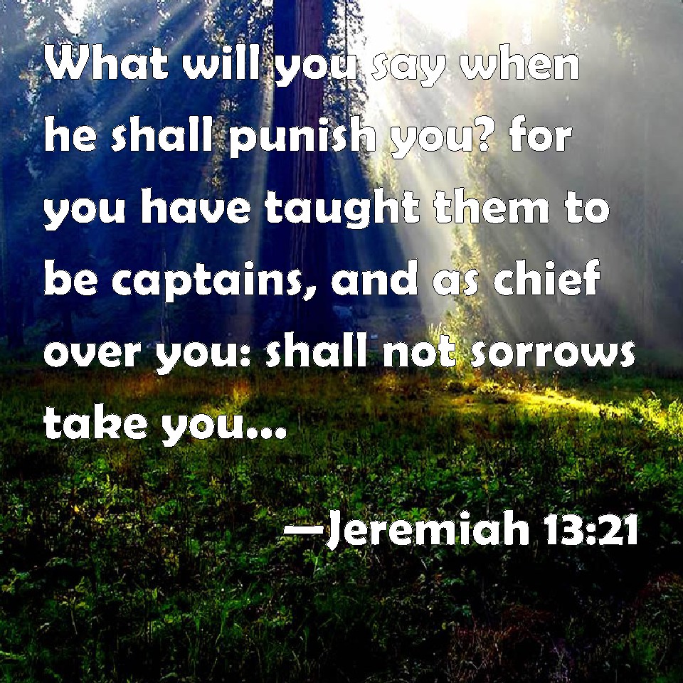 Choose a Background Jeremiah 13:21 What will you say when he shall punish you? for you have taught them to be captains, and as chief over you: shall not sorrows take you, as a woman in travail? KJV: What wilt thou say when he shall punish thee? for thou hast taught them to be captains, and as chief over thee: shall not sorrows take thee, as a woman in travail? DRB: What wilt thou say when he shall visit thee? for thou hast taught them against thee, and instructed them against thy own head: shall not sorrows lay hold on thee, as a woman in labour? DBT: What wilt thou say when he shall visit thee, since thou thyself hast trained them to be princes in chief over thee? Shall not sorrows take thee, as a woman in travail? ERV: What wilt thou say, when he shall set thy friends over thee as head, seeing thou thyself hast instructed them against thee? shall not sorrows take hold of thee, as of a woman in travail? WBT: What wilt thou say when he shall punish thee? for thou hast taught them to be captains, and as chief over thee: shall not sorrows take thee, as a woman in travail? WEB: What will you say, when he shall set over you as head those whom you have yourself taught to be friends to you? shall not sorrows take hold of you, as of a woman in travail? YLT: What dost thou say, when He looketh after thee? And thou — thou hast taught them to be over thee — leaders for head? Do not pangs seize thee as a travailing woman?Links Jeremiah 13:21 NIV • Jeremiah 13:21 NLT • Jeremiah 13:21 ESV • Jeremiah 13:21 NASB • Jeremiah 13:21 KJV • Jeremiah 13:21 Interlinear • Jeremiah 13:21 Commentaries • Jeremiah 13:21 Parallel Texts • Jeremiah 13:21 Bible Apps • Jeremiah 13:21 Parallel • Bible Hub |