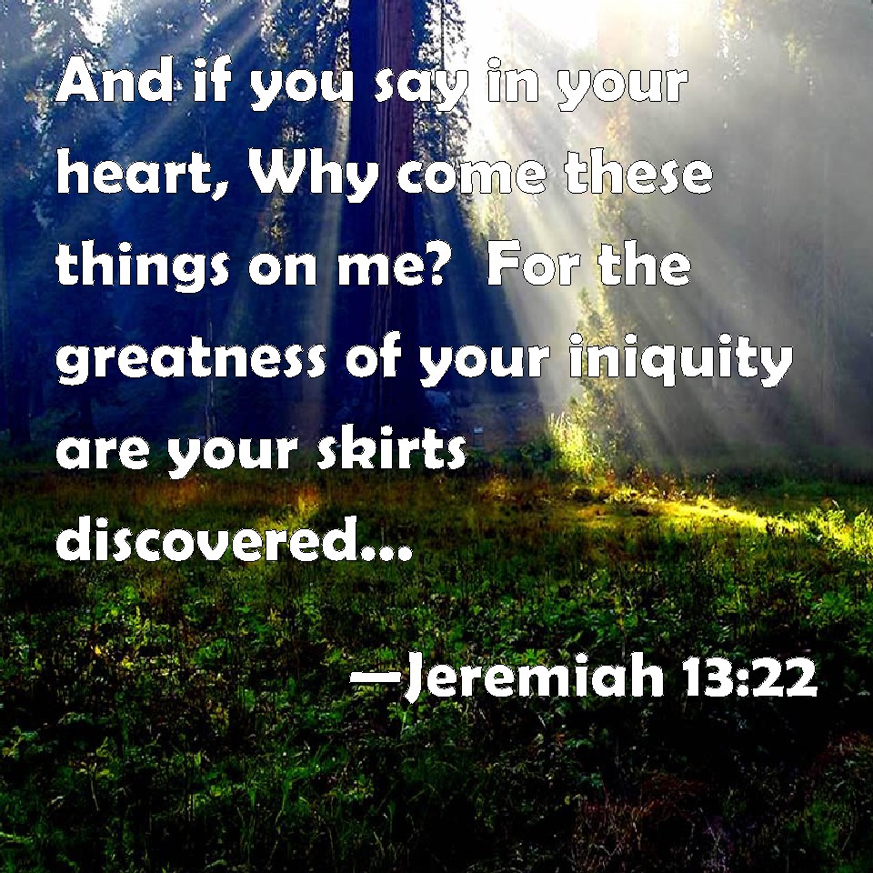 Choose a Background Jeremiah 13:22 And if you say in your heart, Why come these things on me? For the greatness of your iniquity are your skirts discovered, and your heels made bore. KJV: And if thou say in thine heart, Wherefore come these things upon me? For the greatness of thine iniquity are thy skirts discovered, and thy heels made bare. DRB: And if thou shalt say in thy heart: Why are these things come upon me? For the greatness of thy iniquity, thy nakedness is discovered, the soles of thy feet are defiled. DBT: And if thou say in thy heart, Wherefore come these things upon me? For the greatness of thine iniquity are thy skirts uncovered, and thy heels have suffered violence. ERV: And if thou say in thine heart, Wherefore are these things come upon me? for the greatness of thine iniquity are thy skirts discovered, and thy heels suffer violence. WBT: And if thou shalt say in thy heart, Why come these things upon me? For the greatness of thy iniquity are thy skirts uncovered, and thy heels made bare. WEB: If you say in your heart, Why are these things come on me? for the greatness of your iniquity are your skirts uncovered, and your heels suffer violence. YLT: And when thou dost say in thy heart, 'Wherefore have these met me?' For the abundance of thine iniquity Have thy skirts been uncovered, Have thy heels suffered violence.Links Jeremiah 13:22 NIV • Jeremiah 13:22 NLT • Jeremiah 13:22 ESV • Jeremiah 13:22 NASB • Jeremiah 13:22 KJV • Jeremiah 13:22 Interlinear • Jeremiah 13:22 Commentaries • Jeremiah 13:22 Parallel Texts • Jeremiah 13:22 Bible Apps • Jeremiah 13:22 Parallel • Bible Hub |