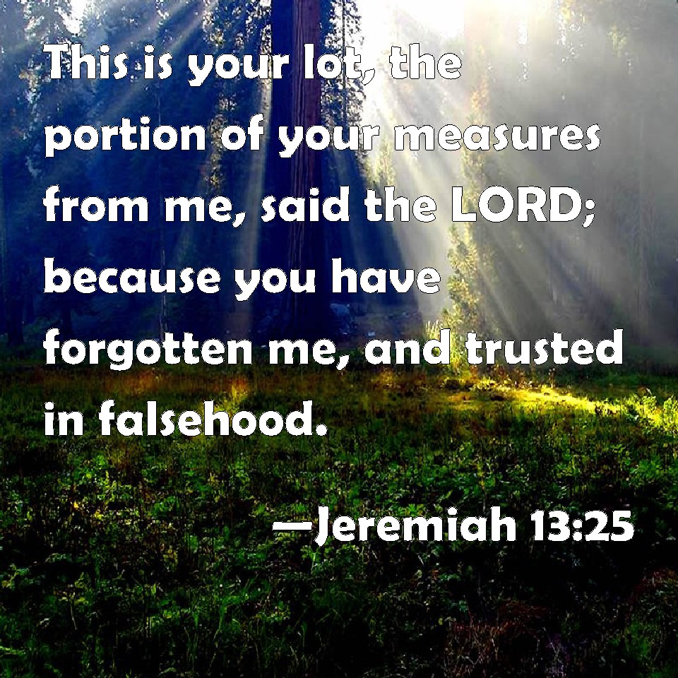 Choose a Background Jeremiah 13:25 This is your lot, the portion of your measures from me, said the LORD; because you have forgotten me, and trusted in falsehood. KJV: This is thy lot, the portion of thy measures from me, saith the LORD; because thou hast forgotten me, and trusted in falsehood. DRB: This is thy lot, and the portion of thy measure from me, saith the Lord, because thou hast forgotten me, and hast trusted in falsehood. DBT: This shall be thy lot, thy measured portion from me, saith Jehovah; because thou hast forgotten me, and confided in falsehood. ERV: This is thy lot, the portion measured unto thee from me, saith the LORD; because thou hast forgotten me, and trusted in falsehood. WBT: This is thy lot, the portion of thy measures from me, saith the LORD; because thou hast forgotten me, and trusted in falsehood. WEB: This is your lot, the portion measured to you from me, says Yahweh; because you have forgotten me, and trusted in falsehood. YLT: This is thy lot, the portion of thy measures from Me — an affirmation of Jehovah, Because thou hast forgotten me, And dost trust in falsehood.Links Jeremiah 13:25 NIV • Jeremiah 13:25 NLT • Jeremiah 13:25 ESV • Jeremiah 13:25 NASB • Jeremiah 13:25 KJV • Jeremiah 13:25 Interlinear • Jeremiah 13:25 Commentaries • Jeremiah 13:25 Parallel Texts • Jeremiah 13:25 Bible Apps • Jeremiah 13:25 Parallel • Bible Hub |