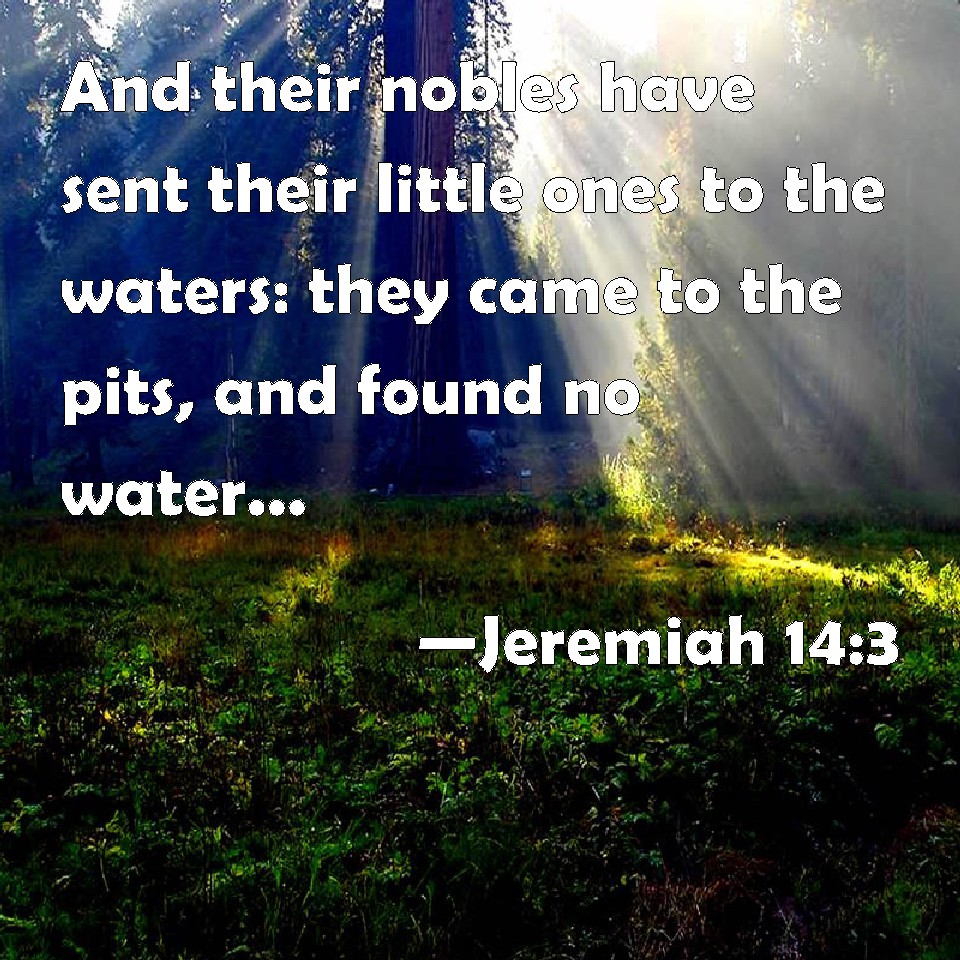 Choose a Background Jeremiah 14:3 And their nobles have sent their little ones to the waters: they came to the pits, and found no water; they returned with their vessels empty; they were ashamed and confounded, and covered their heads. KJV: And their nobles have sent their little ones to the waters: they came to the pits, and found no water; they returned with their vessels empty; they were ashamed and confounded, and covered their heads. DRB: The great ones sent their inferiors to the water: they came to draw, they found no water, they carried back their vessels empty: they were confounded and afflicted, and covered their heads. DBT: And their nobles send their little ones for water: they come to the pits, they find no water; they return with their vessels empty; they are ashamed, they are confounded, and have covered their heads. ERV: And their nobles send their little ones to the waters: they come to the pits, and find no water; they return with their vessels empty: they are ashamed and confounded, and cover their heads. WBT: And their nobles have sent their little ones to the waters: they came to the pits, and found no water; they returned with their vessels empty; they were ashamed and confounded, and covered their heads. WEB: Their nobles send their little ones to the waters: they come to the cisterns, and find no water; they return with their vessels empty; they are disappointed and confounded, and cover their heads. YLT: And their honourable ones have sent their little ones to the water, They have come unto ditches, They have not found water, They have turned back — their vessels empty! They have been ashamed, And have blushed and covered their head.Links Jeremiah 14:3 NIV • Jeremiah 14:3 NLT • Jeremiah 14:3 ESV • Jeremiah 14:3 NASB • Jeremiah 14:3 KJV • Jeremiah 14:3 Interlinear • Jeremiah 14:3 Commentaries • Jeremiah 14:3 Parallel Texts • Jeremiah 14:3 Bible Apps • Jeremiah 14:3 Parallel • Bible Hub |