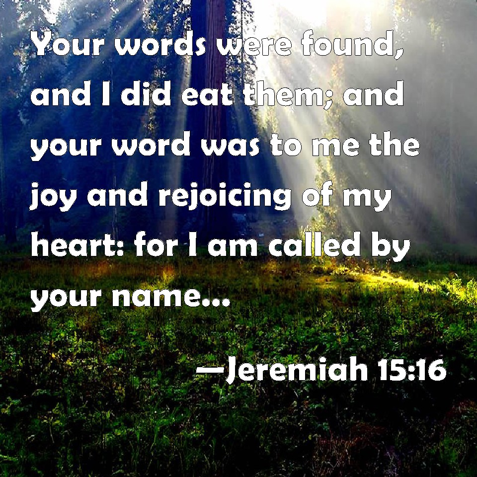 Choose a Background Jeremiah 15:16 Your words were found, and I did eat them; and your word was to me the joy and rejoicing of my heart: for I am called by your name, O LORD God of hosts. KJV: Thy words were found, and I did eat them; and thy word was unto me the joy and rejoicing of mine heart: for I am called by thy name, O LORD God of hosts. DRB: Thy words were found, and I did eat them, and thy word was to me a joy and gladness of my heart: for thy name is called upon me, O Lord God of hosts. DBT: Thy words were found, and I did eat them, and thy words were unto me the joy and rejoicing of my heart; for I am called by thy name, O Jehovah, God of hosts. ERV: Thy words were found, and I did eat them; and thy words were unto me a joy and the rejoicing of mine heart: for I am called by thy name, O LORD God of hosts. WBT: Thy words were found, and I did eat them; and thy word was to me the joy and rejoicing of my heart: for I am called by thy name, O LORD God of hosts. WEB: Your words were found, and I ate them; and your words were to me a joy and the rejoicing of my heart: for I am called by your name, Yahweh, God of Armies. YLT: Thy words have been found, and I eat them, And Thy word is to me for a joy, And for the rejoicing of my heart, For Thy name is called on me, O Jehovah, God of Hosts.Links Jeremiah 15:16 NIV • Jeremiah 15:16 NLT • Jeremiah 15:16 ESV • Jeremiah 15:16 NASB • Jeremiah 15:16 KJV • Jeremiah 15:16 Interlinear • Jeremiah 15:16 Commentaries • Jeremiah 15:16 Parallel Texts • Jeremiah 15:16 Bible Apps • Jeremiah 15:16 Parallel • Bible Hub |