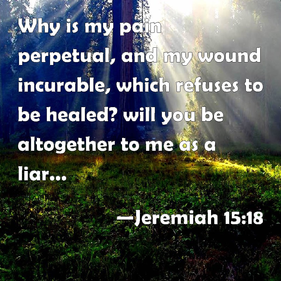 Choose a Background Jeremiah 15:18 Why is my pain perpetual, and my wound incurable, which refuses to be healed? will you be altogether to me as a liar, and as waters that fail? KJV: Why is my pain perpetual, and my wound incurable, which refuseth to be healed? wilt thou be altogether unto me as a liar, and as waters that fail? DRB: Why is my sorrow become perpetual, and my wound desperate so as to refuse to be healed? it is become to me as the falsehood of deceitful waters that cannot be trusted. DBT: Why is my pain perpetual, and my wound incurable? It refuseth to be healed. Wilt thou be altogether unto me as a treacherous spring, as waters that fail? ERV: Why is my pain perpetual, and my wound incurable, which refuseth to be healed? wilt thou indeed be unto me as a deceitful brook, as waters that fail? WBT: Why is my pain perpetual, and my wound incurable, which refuseth to be healed? wilt thou be altogether to me as a liar, and as waters that fail? WEB: Why is my pain perpetual, and my wound incurable, which refuses to be healed? will you indeed be to me as a deceitful [brook], as waters that fail? YLT: Why hath my pain been perpetual? And my wound incurable? It hath refused to be healed, Thou art surely to me as a failing stream, Waters not stedfast.Links Jeremiah 15:18 NIV • Jeremiah 15:18 NLT • Jeremiah 15:18 ESV • Jeremiah 15:18 NASB • Jeremiah 15:18 KJV • Jeremiah 15:18 Interlinear • Jeremiah 15:18 Commentaries • Jeremiah 15:18 Parallel Texts • Jeremiah 15:18 Bible Apps • Jeremiah 15:18 Parallel • Bible Hub |