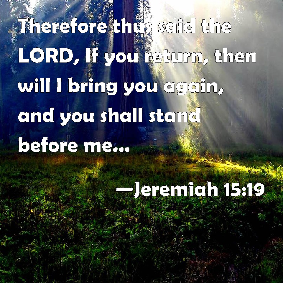 Choose a Background Jeremiah 15:19 Therefore thus said the LORD, If you return, then will I bring you again, and you shall stand before me: and if you take forth the precious from the vile, you shall be as my mouth: let them return to you; but return not you to them. KJV: Therefore thus saith the LORD, If thou return, then will I bring thee again, and thou shalt stand before me: and if thou take forth the precious from the vile, thou shalt be as my mouth: let them return unto thee; but return not thou unto them. DRB: Therefore thus saith the Lord: If thou wilt be converted, I will convert thee, and thou shalt stand before my face; and if thou wilt separate the precious from the vile, thou shalt be as my mouth: they shall be turned to thee, and thou shalt not be turned to them. DBT: Therefore thus saith Jehovah: If thou return, then will I bring thee again, thou shalt stand before me; and if thou take forth the precious from the vile, thou shalt be as my mouth. Let them return unto thee; but return not thou unto them. ERV: Therefore thus saith the LORD, If thou return, then will I bring thee again, that thou mayest stand before me; and if thou take forth the precious from the vile, thou shalt be as my mouth: they shall return unto thee, but thou shalt not return unto them. WBT: Therefore thus saith the LORD, If thou shalt return, then will I bring thee again, and thou shalt stand before me: and if thou shalt separate the precious from the vile, thou shalt be as my mouth: let them return to thee; but return not thou to them. WEB: Therefore thus says Yahweh, If you return, then will I bring you again, that you may stand before me; and if you take forth the precious from the vile, you shall be as my mouth: they shall return to you, but you shall not return to them. YLT: Therefore, thus said Jehovah: If thou turnest back, then I bring thee back, Before Me thou dost stand, And if thou bringest out the precious from the vile, As My mouth thou art! They — they turn back unto thee, And thou dost not turn back unto them.Links Jeremiah 15:19 NIV • Jeremiah 15:19 NLT • Jeremiah 15:19 ESV • Jeremiah 15:19 NASB • Jeremiah 15:19 KJV • Jeremiah 15:19 Interlinear • Jeremiah 15:19 Commentaries • Jeremiah 15:19 Parallel Texts • Jeremiah 15:19 Bible Apps • Jeremiah 15:19 Parallel • Bible Hub |