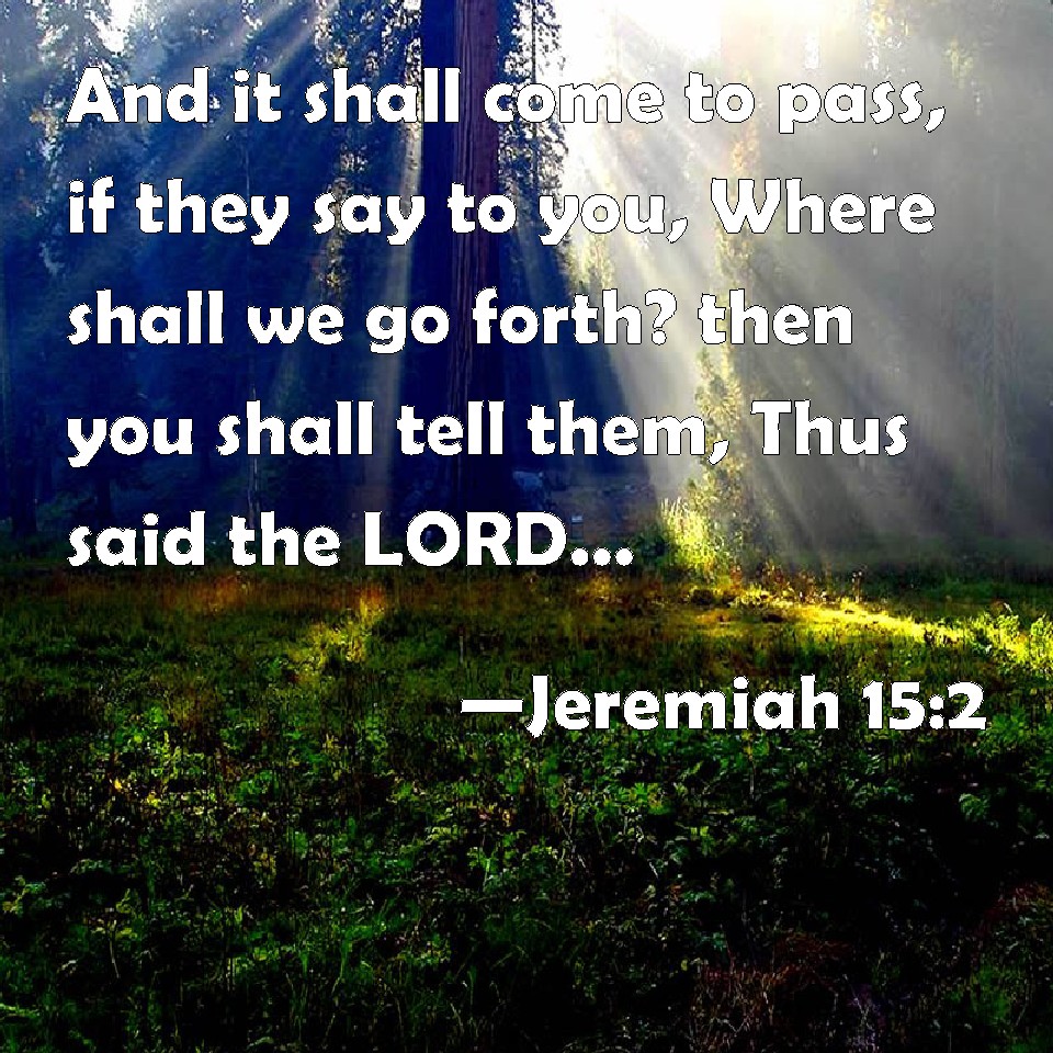 Choose a Background Jeremiah 15:2 And it shall come to pass, if they say to you, Where shall we go forth? then you shall tell them, Thus said the LORD; Such as are for death, to death; and such as are for the sword, to the sword; and such as are for the famine, to the famine; and such as are for the captivity, to the captivity. KJV: And it shall come to pass, if they say unto thee, Whither shall we go forth? then thou shalt tell them, Thus saith the LORD; Such as are for death, to death; and such as are for the sword, to the sword; and such as are for the famine, to the famine; and such as are for the captivity, to the captivity. DRB: And if they shall say unto thee: Whither shall we go forth? thou shalt say to them: Thus saith the Lord: Such as are for death, to death: and such as are to the sword, to the sword: and such as are for famine, to famine: and such as are to captivity, to captivity. DBT: And it shall come to pass, if they say unto thee, Whither shall we go forth? then thou shalt tell them, Thus saith Jehovah: Such as are for death, to death; and such as are for the sword, to the sword; and such as are for the famine, to the famine; and such as are for captivity, to captivity. ERV: And it shall come to pass, when they say unto thee, Whither shall we go forth? then thou shalt tell them, Thus saith the LORD: Such as are for death, to death; and such as are for the sword, to the sword; and such as are for the famine, to the famine; and such as are for captivity, to captivity. WBT: And it shall come to pass, if they say to thee, Whither shall we go forth? then thou shalt tell them, Thus saith the LORD; Such as are for death, to death; and such as are for the sword, to the sword; and such as are for the famine, to the famine; and such as are for the captivity, to the captivity. WEB: It shall happen, when they tell you, Where shall we go forth? Then you shall tell them, Thus says Yahweh: Such as are for death, to death; and such as are for the sword, to the sword; and such as are for the famine, to the famine; and such as are for captivity, to captivity. YLT: And it hath come to pass, when they say to thee, Whither do we go out? that thou hast said unto them, Thus said Jehovah: Those who are for death — to death, And those who are for the sword, to the sword, And those who are for famine, to famine, And those who are for captivity, to captivity.Links Jeremiah 15:2 NIV • Jeremiah 15:2 NLT • Jeremiah 15:2 ESV • Jeremiah 15:2 NASB • Jeremiah 15:2 KJV • Jeremiah 15:2 Interlinear • Jeremiah 15:2 Commentaries • Jeremiah 15:2 Parallel Texts • Jeremiah 15:2 Bible Apps • Jeremiah 15:2 Parallel • Bible Hub |