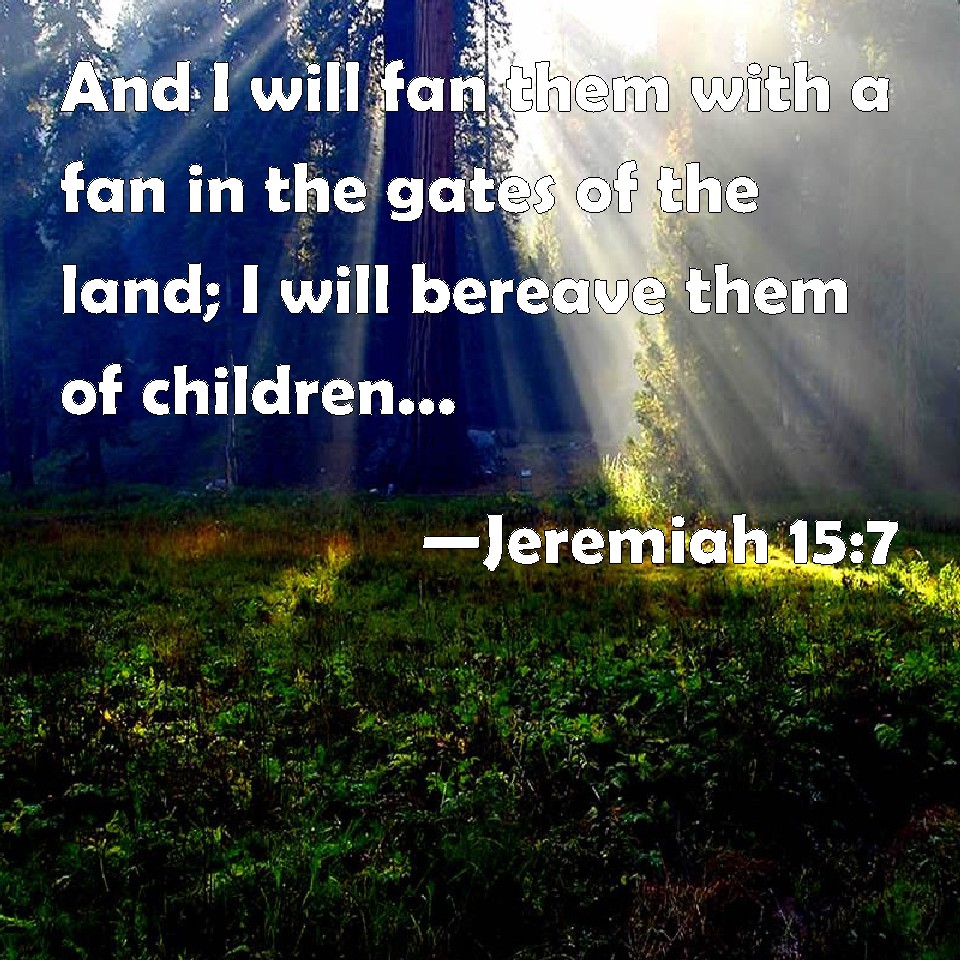 Choose a Background Jeremiah 15:7 And I will fan them with a fan in the gates of the land; I will bereave them of children, I will destroy my people since they return not from their ways. KJV: And I will fan them with a fan in the gates of the land; I will bereave them of children, I will destroy my people, since they return not from their ways. DRB: And I will scatter them with a fan in the gates of the land: I have killed and destroyed my people, and yet they are not returned form their ways. DBT: And I will fan them with a fan in the gates of the land; I will bereave of children and destroy my people: they have not returned from their ways. ERV: And I have fanned them with a fan in the gates of the land; I have bereaved them of children, I have destroyed my people; they have not returned from their ways. WBT: And I will fan them with a fan in the gates of the land; I will bereave them of children, I will destroy my people, since they return not from their ways. WEB: I have winnowed them with a fan in the gates of the land; I have bereaved [them] of children, I have destroyed my people; they didn't return from their ways. YLT: And I scatter them with a fan, in the gates the land, I bereaved, I have destroyed My people, From their ways they turned not back.Links Jeremiah 15:7 NIV • Jeremiah 15:7 NLT • Jeremiah 15:7 ESV • Jeremiah 15:7 NASB • Jeremiah 15:7 KJV • Jeremiah 15:7 Interlinear • Jeremiah 15:7 Commentaries • Jeremiah 15:7 Parallel Texts • Jeremiah 15:7 Bible Apps • Jeremiah 15:7 Parallel • Bible Hub |