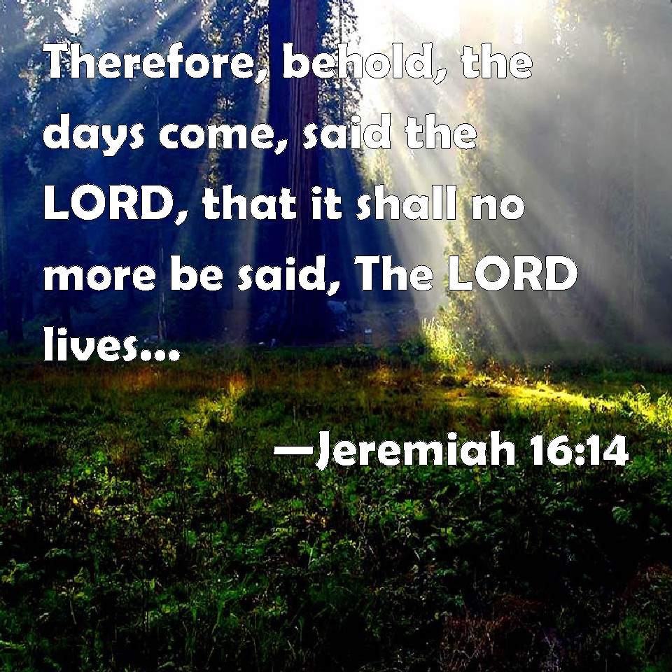 Choose a Background Jeremiah 16:14 Therefore, behold, the days come, said the LORD, that it shall no more be said, The LORD lives, that brought up the children of Israel out of the land of Egypt; KJV: Therefore, behold, the days come, saith the LORD, that it shall no more be said, The LORD liveth, that brought up the children of Israel out of the land of Egypt; DRB: Therefore behold the days come, saith the Lord, when it shall be said no more: The Lord liveth, that brought for the children of Israel out of the land of Egypt: DBT: Therefore, behold, days are coming, saith Jehovah, that it shall no more be said, As Jehovah liveth, who brought up the children of Israel out of the land of Egypt; ERV: Therefore, behold, the days come, saith the LORD, that it shall no more be said, As the LORD liveth, that brought up the children of Israel out of the land of Egypt; WBT: Therefore behold, the days come, saith the LORD, that it shall no more be said, The LORD liveth, that brought the children of Israel out of the land of Egypt; WEB: Therefore, behold, the days come, says Yahweh, that it shall no more be said, As Yahweh lives, who brought up the children of Israel out of the land of Egypt; YLT: Therefore, lo, days are coming, An affirmation of Jehovah, And it is not said any more: 'Jehovah liveth, who brought up The sons of Israel out of the land of Egypt,'Links Jeremiah 16:14 NIV • Jeremiah 16:14 NLT • Jeremiah 16:14 ESV • Jeremiah 16:14 NASB • Jeremiah 16:14 KJV • Jeremiah 16:14 Interlinear • Jeremiah 16:14 Commentaries • Jeremiah 16:14 Parallel Texts • Jeremiah 16:14 Bible Apps • Jeremiah 16:14 Parallel • Bible Hub |