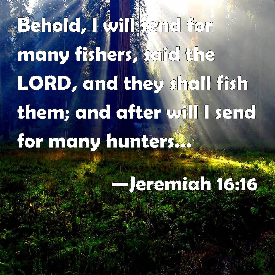 Choose a Background Jeremiah 16:16 Behold, I will send for many fishers, said the LORD, and they shall fish them; and after will I send for many hunters, and they shall hunt them from every mountain, and from every hill, and out of the holes of the rocks. KJV: Behold, I will send for many fishers, saith the LORD, and they shall fish them; and after will I send for many hunters, and they shall hunt them from every mountain, and from every hill, and out of the holes of the rocks. DRB: Behold I will send many fishers, saith the Lord, and they shall fish them: and after this I will send them many hunters, and they shall hunt them from every mountain, and from every hill, and out of the holes of the rocks. DBT: Behold, I will send for many fishers, saith Jehovah, and they shall fish them; and afterwards will I send for many hunters, and they shall hunt them, from every mountain, and from every hill, and out of the holes of the rocks. ERV: Behold, I will send for many fishers saith the LORD, and they shall fish them; and afterward I will send for many hunters, and they shall hunt them from every mountain, and from every hill, and out of the holes of the rocks. WBT: Behold, I will send for many fishers, saith the LORD, and they shall fish them; and afterwards will I send for many hunters, and they shall hunt them from every mountain, and from every hill, and out of the holes of the rocks. WEB: Behold, I will send for many fishermen, says Yahweh, and they shall fish them up; and afterward I will send for many hunters, and they shall hunt them from every mountain, and from every hill, and out of the clefts of the rocks. YLT: Lo, I am sending for many fishers, An affirmation of Jehovah, And they have fished them, And after this I send for many hunters, And they have hunted them from off every mountain, And from off every hill, and from holes of the rocks.Links Jeremiah 16:16 NIV • Jeremiah 16:16 NLT • Jeremiah 16:16 ESV • Jeremiah 16:16 NASB • Jeremiah 16:16 KJV • Jeremiah 16:16 Interlinear • Jeremiah 16:16 Commentaries • Jeremiah 16:16 Parallel Texts • Jeremiah 16:16 Bible Apps • Jeremiah 16:16 Parallel • Bible Hub |