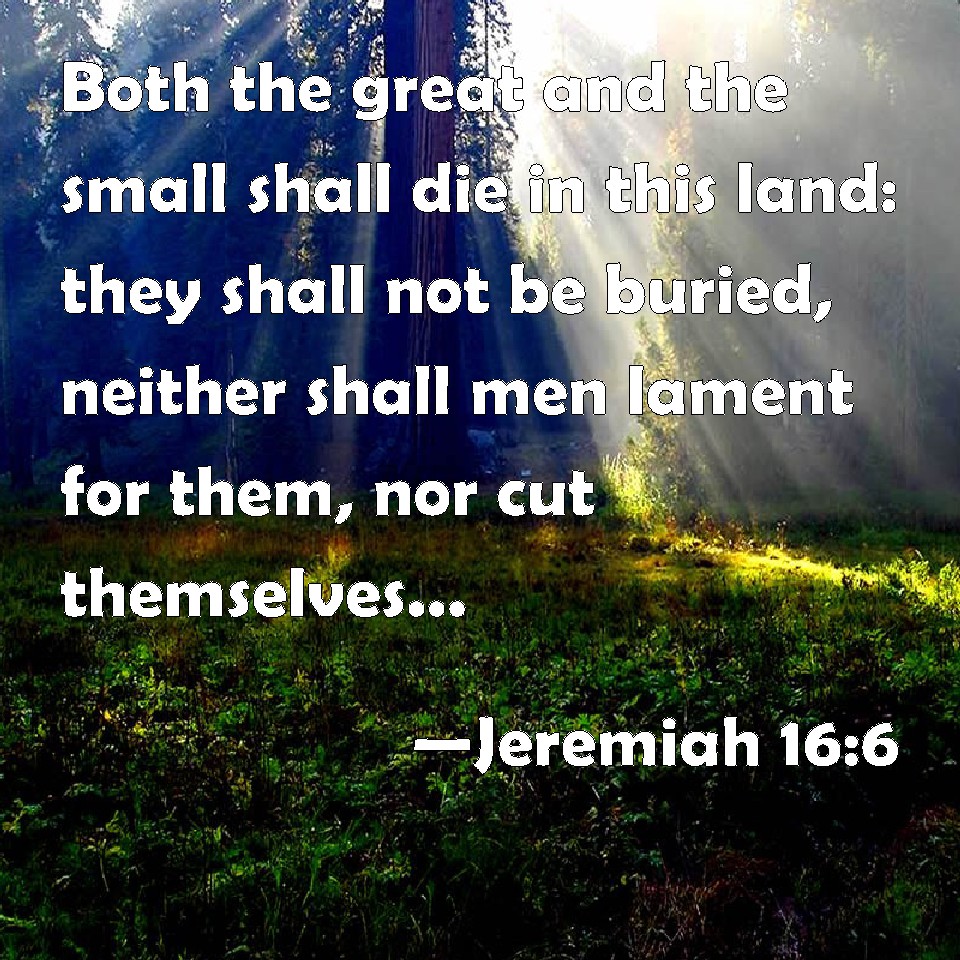 Choose a Background Jeremiah 16:6 Both the great and the small shall die in this land: they shall not be buried, neither shall men lament for them, nor cut themselves, nor make themselves bald for them: KJV: Both the great and the small shall die in this land: they shall not be buried, neither shall men lament for them, nor cut themselves, nor make themselves bald for them: DRB: Both the great and the little shall die in the land: they shall not be buried nor lamented, and men shall not cut themselves, nor make themselves bald for them. DBT: Both great and small shall die in this land: they shall not be buried; and none shall lament for them, or cut themselves, nor make themselves bald for them. ERV: Both great and small shall die in this land: they shall not be buried, neither shall men lament for them, nor cut themselves, nor make themselves bald for them: WBT: Both the great and the small shall die in this land: they shall not be buried, neither shall men lament for them, nor cut themselves, nor make themselves bald for them: WEB: Both great and small shall die in this land; they shall not be buried, neither shall men lament for them, nor cut themselves, nor make themselves bald for them; YLT: And died have great and small in this land, They are not buried, and none lament for them, Nor doth any cut himself, nor become bald for them.Links Jeremiah 16:6 NIV • Jeremiah 16:6 NLT • Jeremiah 16:6 ESV • Jeremiah 16:6 NASB • Jeremiah 16:6 KJV • Jeremiah 16:6 Interlinear • Jeremiah 16:6 Commentaries • Jeremiah 16:6 Parallel Texts • Jeremiah 16:6 Bible Apps • Jeremiah 16:6 Parallel • Bible Hub |