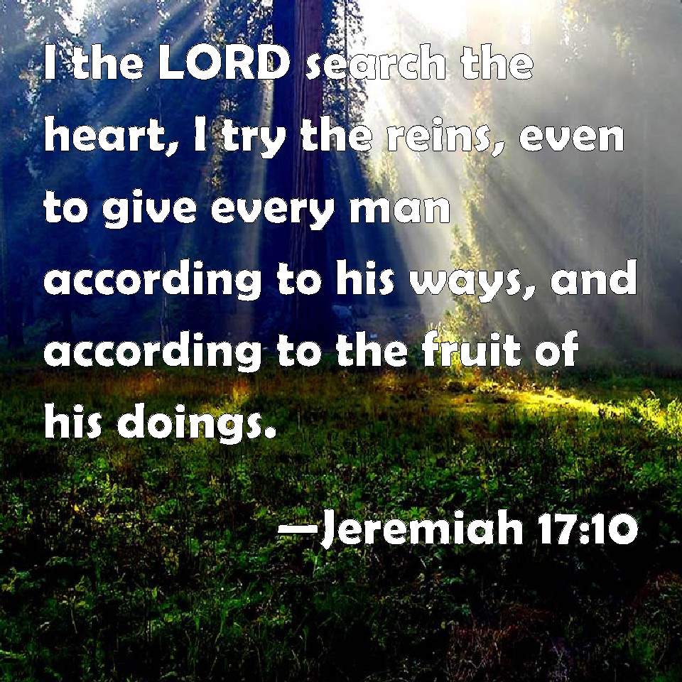 Choose a Background Jeremiah 17:10 I the LORD search the heart, I try the reins, even to give every man according to his ways, and according to the fruit of his doings. KJV: I the LORD search the heart, I try the reins, even to give every man according to his ways, and according to the fruit of his doings. DRB: I am the Lord who search the heart and prove the reins: who give to every one according to his way, and according to the fruit of his devices. DBT: I Jehovah search the heart, I try the reins, even to give each one according to his ways, according to the fruit of his doings. ERV: I the LORD search the heart, I try the reins, even to give every man according to his ways, according to the fruit of his doings. WBT: I the LORD search the heart, I try the reins, even to give every man according to his ways, and according to the fruit of his doings. WEB: I, Yahweh, search the mind, I try the heart, even to give every man according to his ways, according to the fruit of his doings. YLT: I Jehovah do search the heart, try the reins, Even to give to each according to his way, According to the fruit of his doings.Links Jeremiah 17:10 NIV • Jeremiah 17:10 NLT • Jeremiah 17:10 ESV • Jeremiah 17:10 NASB • Jeremiah 17:10 KJV • Jeremiah 17:10 Interlinear • Jeremiah 17:10 Commentaries • Jeremiah 17:10 Parallel Texts • Jeremiah 17:10 Bible Apps • Jeremiah 17:10 Parallel • Bible Hub |
