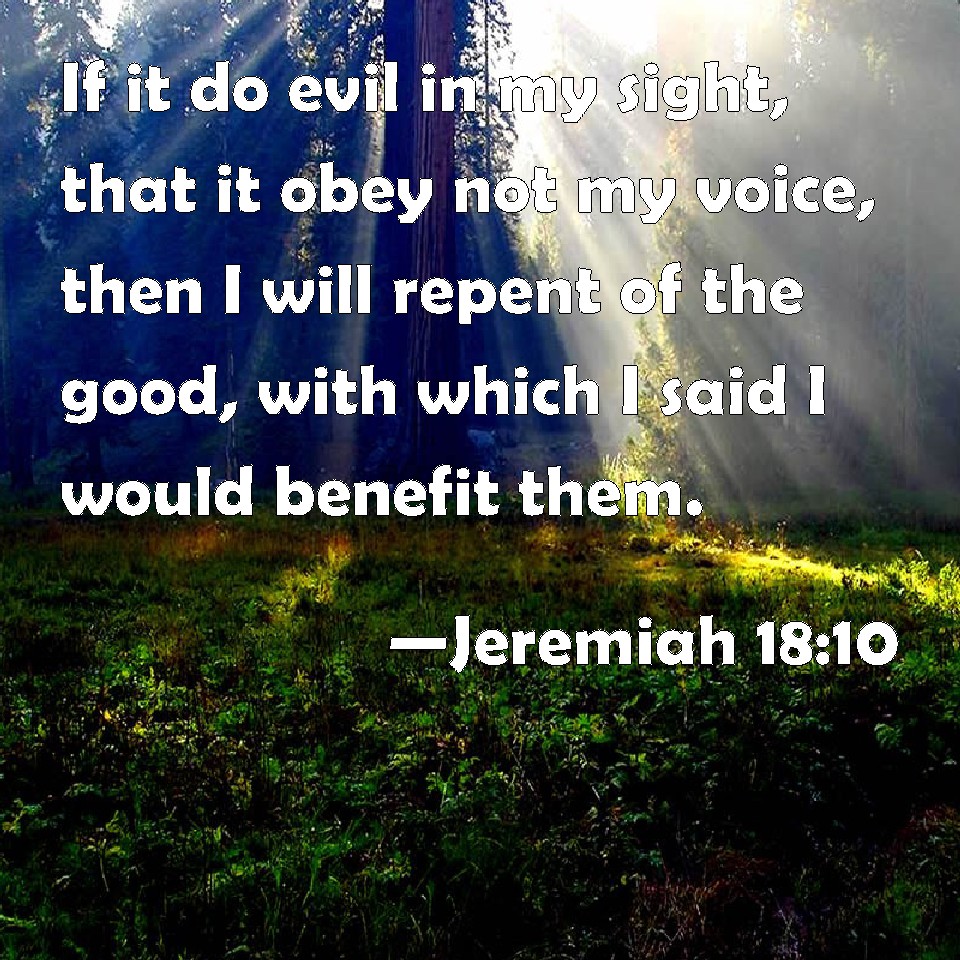 Choose a Background Jeremiah 18:10 If it do evil in my sight, that it obey not my voice, then I will repent of the good, with which I said I would benefit them. KJV: If it do evil in my sight, that it obey not my voice, then I will repent of the good, wherewith I said I would benefit them. DRB: If it shall do evil in my sight, that it obey not my voice: I will repent of the good that I have spoken to do unto it. DBT: if it do evil in my sight, that it hearken not unto my voice, then I will repent of the good wherewith I said I would benefit them. ERV: if it do evil in my sight, that it obey not my voice, then I will repent of the good, wherewith I said I would benefit them. WBT: If it shall do evil in my sight, that it obey not my voice, then I will repent of the good, with which I said I would benefit them. WEB: if they do that which is evil in my sight, that they not obey my voice, then I will repent of the good, with which I said I would benefit them. YLT: And it hath done the evil thing in Mine eyes, So as not to hearken to My voice, Then I have repented of the good That I have spoken of doing to it.Links Jeremiah 18:10 NIV • Jeremiah 18:10 NLT • Jeremiah 18:10 ESV • Jeremiah 18:10 NASB • Jeremiah 18:10 KJV • Jeremiah 18:10 Interlinear • Jeremiah 18:10 Commentaries • Jeremiah 18:10 Parallel Texts • Jeremiah 18:10 Bible Apps • Jeremiah 18:10 Parallel • Bible Hub |