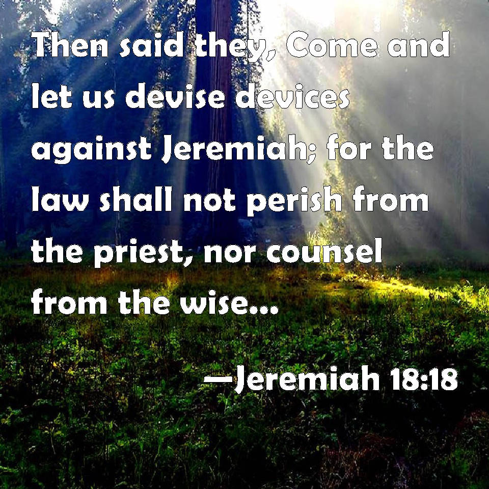 Choose a Background Jeremiah 18:18 Then said they, Come and let us devise devices against Jeremiah; for the law shall not perish from the priest, nor counsel from the wise, nor the word from the prophet. Come, and let us smite him with the tongue, and let us not give heed to any of his words. KJV: Then said they, Come, and let us devise devices against Jeremiah; for the law shall not perish from the priest, nor counsel from the wise, nor the word from the prophet. Come, and let us smite him with the tongue, and let us not give heed to any of his words. DRB: And they said: Come, and let us invent devices against Jeremias: for the law shall not perish from the priest, nor counsel from the wise, nor the word from the prophet: come, and let us strike him with the tongue, and let us give no heed to all his words. DBT: And they said, Come, and let us devise devices against Jeremiah; for law shall not perish from the priest, nor counsel from the wise, nor word from the prophet. Come and let us smite him with the tongue, and let us not give heed to any of his words. ERV: Then said they, Come, and let us devise devices against Jeremiah; for the law shall not perish from the priest, nor counsel from the wise, nor the word from the prophet. Come, and let us smite him with the tongue, and let us not give heed to any of his words. WBT: Then said they, Come, and let us devise devices against Jeremiah; for the law shall not perish from the priest, nor counsel from the wise, nor the word from the prophet. Come, and let us smite him with the tongue, and let us not give heed to any of his words. WEB: Then they said, Come, and let us devise devices against Jeremiah; for the law shall not perish from the priest, nor counsel from the wise, nor the word from the prophet. Come, and let us strike him with the tongue, and let us not give heed to any of his words. YLT: And they say, Come, And we devise against Jeremiah devices, For law doth not perish from the priest, Nor counsel from the wise, Nor the word from the prophet, Come, and we smite him with the tongue, And we do not attend to any of his words.Links Jeremiah 18:18 NIV • Jeremiah 18:18 NLT • Jeremiah 18:18 ESV • Jeremiah 18:18 NASB • Jeremiah 18:18 KJV • Jeremiah 18:18 Interlinear • Jeremiah 18:18 Commentaries • Jeremiah 18:18 Parallel Texts • Jeremiah 18:18 Bible Apps • Jeremiah 18:18 Parallel • Bible Hub |