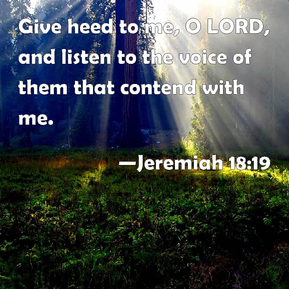 Choose a Background Jeremiah 18:19 Give heed to me, O LORD, and listen to the voice of them that contend with me. KJV: Give heed to me, O LORD, and hearken to the voice of them that contend with me. DRB: Give heed to me, O Lord, and hear the voice of my adversaries. DBT: Jehovah, give heed to me, and listen to the voice of those that contend with me. ERV: Give heed to me, O LORD, and hearken to the voice of them that contend with me. WBT: Give heed to me, O LORD, and hearken to the voice of them that contend with me. WEB: Give heed to me, Yahweh, and listen to the voice of those who contend with me. YLT: Give attention, O Jehovah, unto me, And hearken to the voice of those contending with me.Links Jeremiah 18:19 NIV • Jeremiah 18:19 NLT • Jeremiah 18:19 ESV • Jeremiah 18:19 NASB • Jeremiah 18:19 KJV • Jeremiah 18:19 Interlinear • Jeremiah 18:19 Commentaries • Jeremiah 18:19 Parallel Texts • Jeremiah 18:19 Bible Apps • Jeremiah 18:19 Parallel • Bible Hub |
