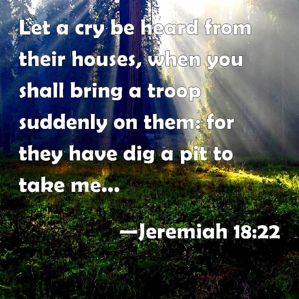 Choose a Background Jeremiah 18:22 Let a cry be heard from their houses, when you shall bring a troop suddenly on them: for they have dig a pit to take me, and hid snares for my feet. KJV: Let a cry be heard from their houses, when thou shalt bring a troop suddenly upon them: for they have digged a pit to take me, and hid snares for my feet. DRB: Let a cry be heard out of their houses: for thou shalt bring the robber upon them suddenly: because they have digged a pit to take me, and have hid snares for my feet. DBT: Let a cry be heard from their houses, when thou shalt bring a troop suddenly upon them; for they have digged a pit to take me, and have hidden snares for my feet. ERV: Let a cry be heard from their houses, when thou shalt bring a troop suddenly upon them: for they have digged a pit to take me, and hid snares for my feet. WBT: Let a cry be heard from their houses, when thou shalt bring a troop suddenly upon them: for they have digged a pit to take me, and hid snares for my feet. WEB: Let a cry be heard from their houses, when you shall bring a troop suddenly on them; for they have dug a pit to take me, and hid snares for my feet. YLT: A cry is heard from their houses, For Thou bringest against them suddenly a troop, For they dug a pit to capture me, And snares they have hidden for my feet.Links Jeremiah 18:22 NIV • Jeremiah 18:22 NLT • Jeremiah 18:22 ESV • Jeremiah 18:22 NASB • Jeremiah 18:22 KJV • Jeremiah 18:22 Interlinear • Jeremiah 18:22 Commentaries • Jeremiah 18:22 Parallel Texts • Jeremiah 18:22 Bible Apps • Jeremiah 18:22 Parallel • Bible Hub |