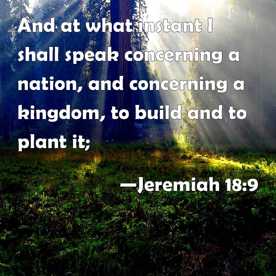 Choose a Background Jeremiah 18:9 And at what instant I shall speak concerning a nation, and concerning a kingdom, to build and to plant it; KJV: And at what instant I shall speak concerning a nation, and concerning a kingdom, to build and to plant it; DRB: And I will suddenly speak of a nation and of a kingdom, to build up and plant it. DBT: And at the moment that I speak concerning a nation and concerning a kingdom, to build and to plant, ERV: And at what instant I shall speak concerning a nation, and concerning a kingdom, to build and to plant it; WBT: And at what instant I shall speak concerning a nation, and concerning a kingdom, to build and to plant it; WEB: At what instant I shall speak concerning a nation, and concerning a kingdom, to build and to plant it; YLT: And the moment I speak concerning a nation, And concerning a kingdom, to build, and to plant,Links Jeremiah 18:9 NIV • Jeremiah 18:9 NLT • Jeremiah 18:9 ESV • Jeremiah 18:9 NASB • Jeremiah 18:9 KJV • Jeremiah 18:9 Interlinear • Jeremiah 18:9 Commentaries • Jeremiah 18:9 Parallel Texts • Jeremiah 18:9 Bible Apps • Jeremiah 18:9 Parallel • Bible Hub |