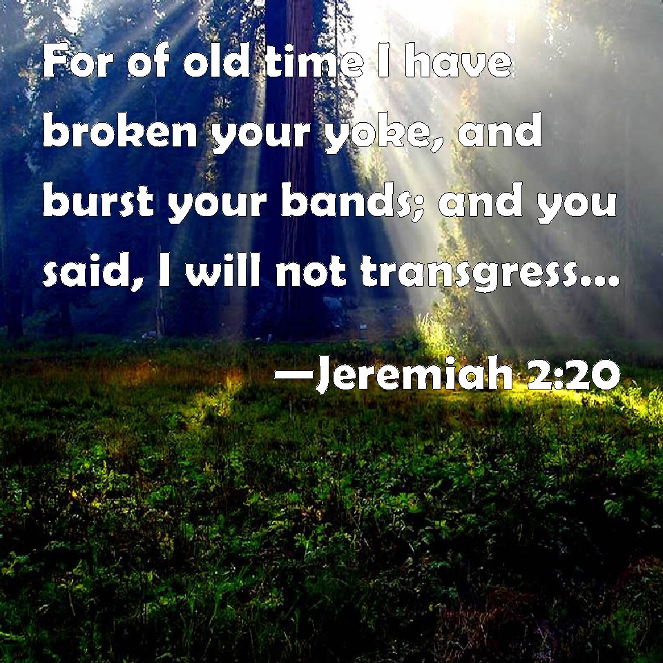 Choose a Background Jeremiah 2:20 For of old time I have broken your yoke, and burst your bands; and you said, I will not transgress; when on every high hill and under every green tree you wander, playing the harlot. KJV: For of old time I have broken thy yoke, and burst thy bands; and thou saidst, I will not transgress; when upon every high hill and under every green tree thou wanderest, playing the harlot. DRB: Of old time thou hast broken my yoke, thou hast burst my bands, and thou saidst: I will not serve. For on every high hill, and under every green tree thou didst prostitute thyself. DBT: For of old thou hast broken thy yoke, and burst thy bands; and thou saidst, I will not serve. For upon every high hill, and under every green tree, thou bowest down, playing the harlot. ERV: For of old time I have broken thy yoke, and burst thy bands; and thou saidst, I will not serve; for upon every high hill and under every green tree thou didst bow thyself, playing the harlot. WBT: For of old time I have broken thy yoke, and burst thy bands; and thou saidst, I will not transgress; when upon every high hill and under every green tree thou wanderest, playing the harlot. WEB: "For of old time I have broken your yoke, and burst your bonds; and you said, 'I will not serve;' for on every high hill and under every green tree you bowed yourself, playing the prostitute. YLT: For from of old thou hast broken thy yoke, Drawn away thy bands, and sayest, 'I do not serve,' For, on every high height, and under every green tree, Thou art wandering — a harlot.Links Jeremiah 2:20 NIV • Jeremiah 2:20 NLT • Jeremiah 2:20 ESV • Jeremiah 2:20 NASB • Jeremiah 2:20 KJV • Jeremiah 2:20 Interlinear • Jeremiah 2:20 Commentaries • Jeremiah 2:20 Parallel Texts • Jeremiah 2:20 Bible Apps • Jeremiah 2:20 Parallel • Bible Hub |