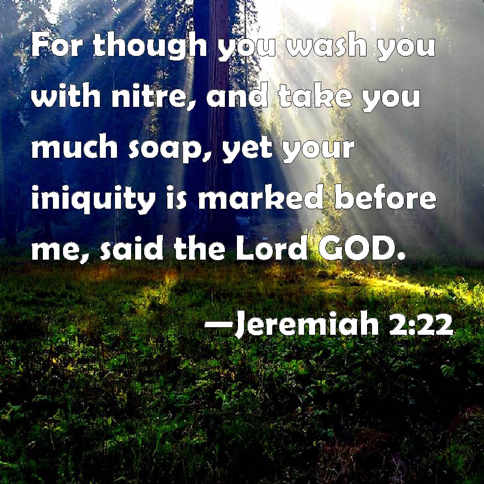 Choose a Background Jeremiah 2:22 For though you wash you with nitre, and take you much soap, yet your iniquity is marked before me, said the Lord GOD. KJV: For though thou wash thee with nitre, and take thee much soap, yet thine iniquity is marked before me, saith the Lord GOD. DRB: Though thou wash thyself with nitre, and multiply to thyself the herb borith, thou art stained in thy iniquity before me, saith the Lord God. DBT: For though thou wash thee with nitre, and take thee much potash, thine iniquity is marked before me, saith the Lord Jehovah. ERV: For though thou wash thee with lye, and take thee much soap, yet thine iniquity is marked before me, saith the Lord GOD. WBT: For though thou shalt wash thee with niter, and take thee much soap, yet thy iniquity is marked before me, saith the Lord GOD. WEB: For though you wash yourself with lye, and use much soap, yet your iniquity is marked before me," says the Lord Yahweh. YLT: But though thou dost wash with nitre, And dost multiply to thyself soap, Marked is thine iniquity before Me, An affirmation of the Lord Jehovah.Links Jeremiah 2:22 NIV • Jeremiah 2:22 NLT • Jeremiah 2:22 ESV • Jeremiah 2:22 NASB • Jeremiah 2:22 KJV • Jeremiah 2:22 Interlinear • Jeremiah 2:22 Commentaries • Jeremiah 2:22 Parallel Texts • Jeremiah 2:22 Bible Apps • Jeremiah 2:22 Parallel • Bible Hub |