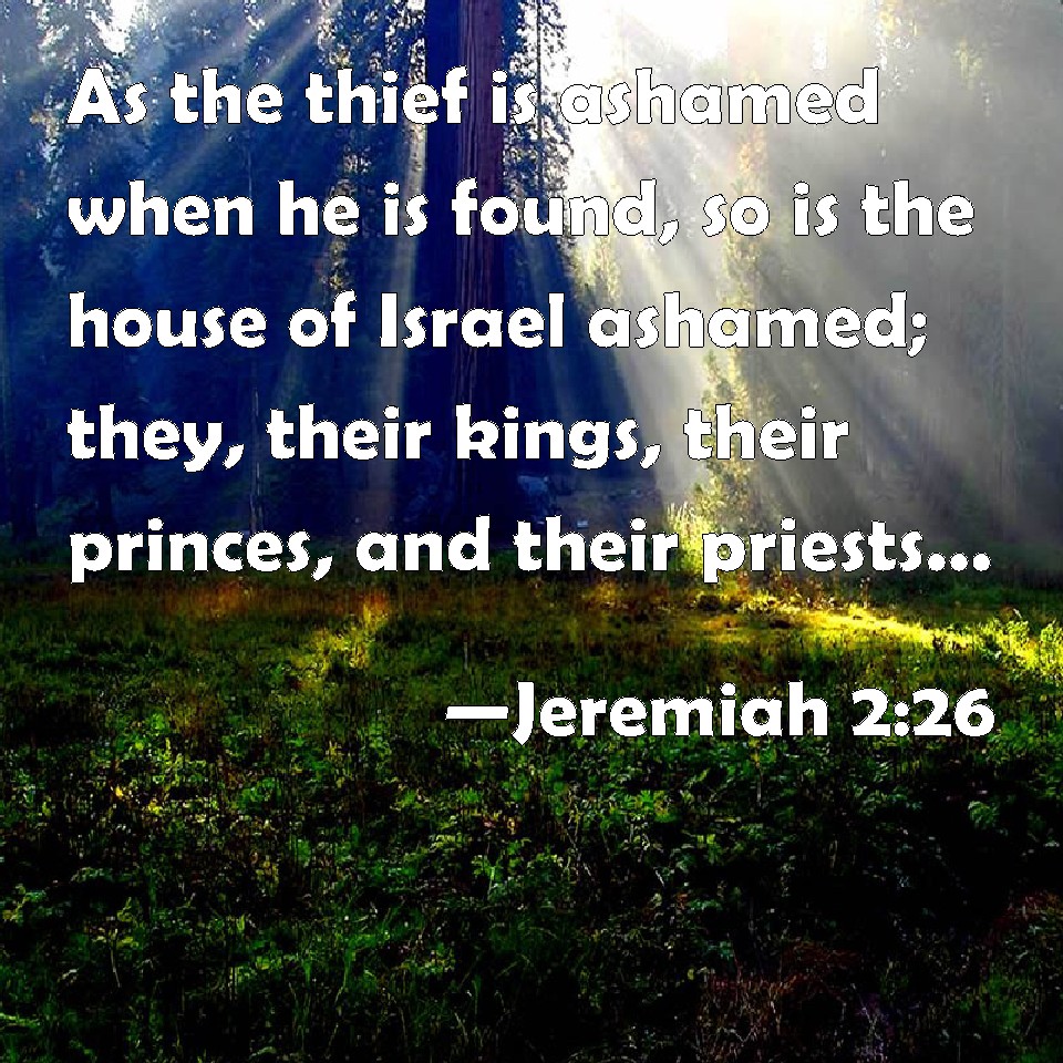 Choose a Background Jeremiah 2:26 As the thief is ashamed when he is found, so is the house of Israel ashamed; they, their kings, their princes, and their priests, and their prophets. KJV: As the thief is ashamed when he is found, so is the house of Israel ashamed; they, their kings, their princes, and their priests, and their prophets, DRB: As the thief is confounded when he is taken, so is the house of Israel confounded, they and their kings, their princes and their priests, and their prophets. DBT: As a thief is ashamed when he is found, so shall the house of Israel be ashamed they, their kings, their princes, and their priests, and their prophets — ERV: As the thief is ashamed when he is found, so is the house of Israel ashamed; they, their kings, their princes, and their priests, and their prophets; WBT: As the thief is ashamed when he is found, so is the house of Israel ashamed: they, their kings, their princes, and their priests, and their prophets, WEB: As the thief is ashamed when he is found, so is the house of Israel ashamed; they, their kings, their princes, and their priests, and their prophets; YLT: As the shame of a thief when he is found, So put to shame have been the house of Israel, They, their kings, their heads, And their priests, and their prophets,Links Jeremiah 2:26 NIV • Jeremiah 2:26 NLT • Jeremiah 2:26 ESV • Jeremiah 2:26 NASB • Jeremiah 2:26 KJV • Jeremiah 2:26 Interlinear • Jeremiah 2:26 Commentaries • Jeremiah 2:26 Parallel Texts • Jeremiah 2:26 Bible Apps • Jeremiah 2:26 Parallel • Bible Hub |