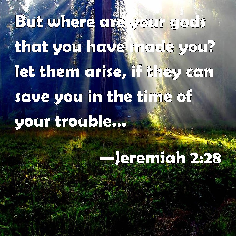 Choose a Background Jeremiah 2:28 But where are your gods that you have made you? let them arise, if they can save you in the time of your trouble: for according to the number of your cities are your gods, O Judah. KJV: But where are thy gods that thou hast made thee? let them arise, if they can save thee in the time of thy trouble: for according to the number of thy cities are thy gods, O Judah. DRB: Where are the gods, whom thou hast made thee? let them arise and deliver thee in the time of thy affliction: for according to the number of thy cities were thy gods, O Juda. DBT: Where then are thy gods that thou hast made for thyself? let them arise, if they can save thee in the time of thy trouble: for as the number of thy cities, are thy gods, O Judah. ERV: But where are thy gods that thou hast made thee? let them arise, if they can save thee in the time of thy trouble: for according to the number of thy cities are thy gods, O Judah. WBT: But where are thy gods that thou hast made for thyself? let them arise, if they can save thee in the time of thy trouble: for according to the number of thy cities are thy gods, O Judah. WEB: "But where are your gods that you have made for yourselves? Let them arise, if they can save you in the time of your trouble: for according to the number of your cities are your gods, Judah. YLT: And where are thy gods, that thou hast made to thyself? Let them arise, if they may save thee, In the time of thy vexation, For — the number of thy cities have been thy gods, O Judah,Links Jeremiah 2:28 NIV • Jeremiah 2:28 NLT • Jeremiah 2:28 ESV • Jeremiah 2:28 NASB • Jeremiah 2:28 KJV • Jeremiah 2:28 Interlinear • Jeremiah 2:28 Commentaries • Jeremiah 2:28 Parallel Texts • Jeremiah 2:28 Bible Apps • Jeremiah 2:28 Parallel • Bible Hub |