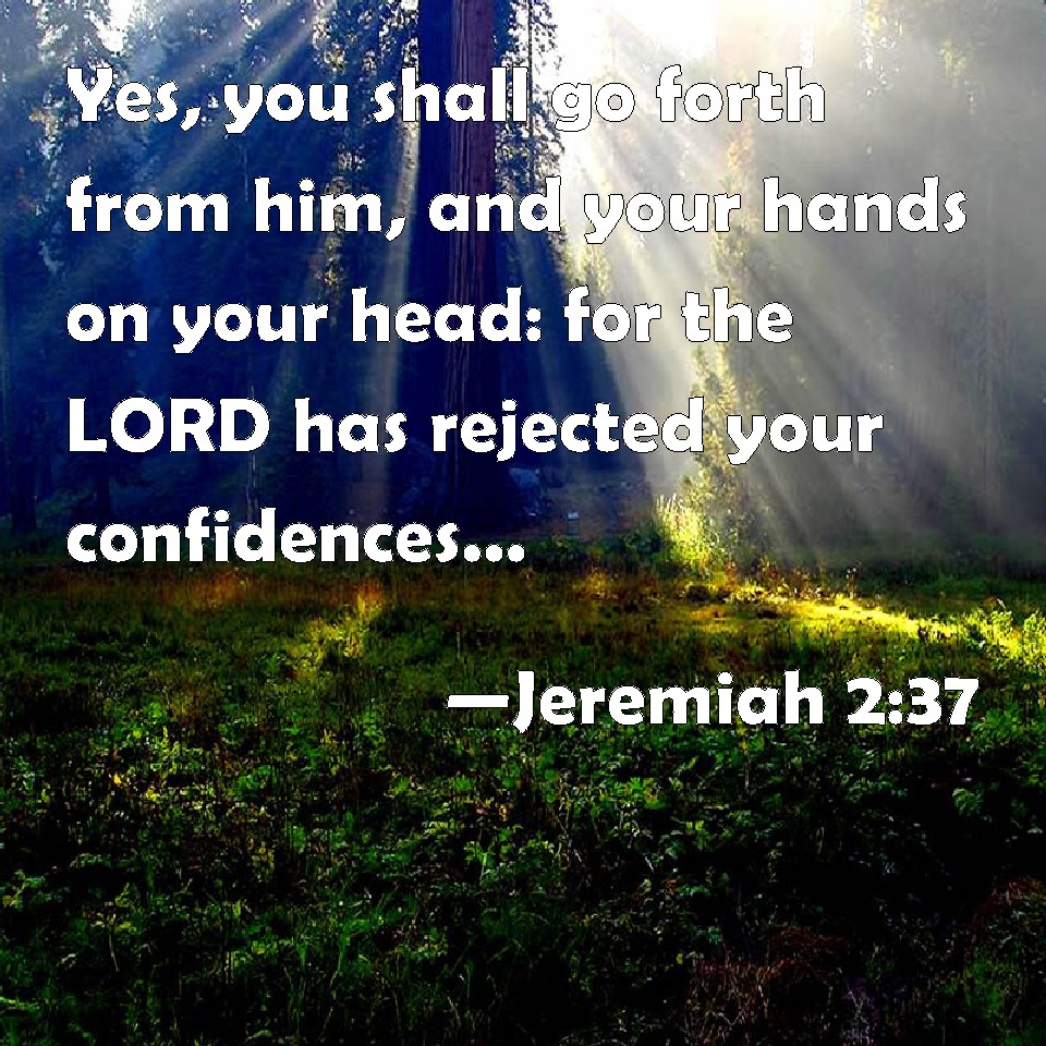 Choose a Background Jeremiah 2:37 Yes, you shall go forth from him, and your hands on your head: for the LORD has rejected your confidences, and you shall not prosper in them. KJV: Yea, thou shalt go forth from him, and thine hands upon thine head: for the LORD hath rejected thy confidences, and thou shalt not prosper in them. DRB: For from thence thou shalt go, and thy hand shall be upon thy head: for the Lord hath destroyed thy trust, and thou shalt have nothing prosperous therein. DBT: Thou shalt indeed go forth from her with thy hands upon thy head; for Jehovah hath rejected those thou confidest in, and thou shalt not prosper by them. ERV: From him also shalt thou go forth, with thine hands upon thine head: for the LORD hath rejected thy confidences, and thou shalt not prosper in them. WBT: Yes, thou shalt go forth from him, and thy hands upon thy head: for the LORD hath rejected thy confidences, and thou shalt not prosper in them. WEB: From there also you shall go forth, with your hands on your head; for Yahweh has rejected those in whom you trust, and you shall not prosper with them. YLT: Also from this thou goest out, And thy hands on thy head, For Jehovah hath kicked at thy confidences, And thou dost not give prosperity to them!Links Jeremiah 2:37 NIV • Jeremiah 2:37 NLT • Jeremiah 2:37 ESV • Jeremiah 2:37 NASB • Jeremiah 2:37 KJV • Jeremiah 2:37 Interlinear • Jeremiah 2:37 Commentaries • Jeremiah 2:37 Parallel Texts • Jeremiah 2:37 Bible Apps • Jeremiah 2:37 Parallel • Bible Hub |