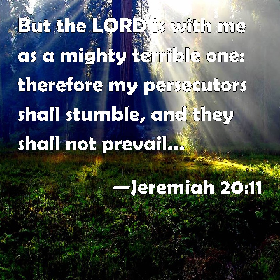 Choose a Background Jeremiah 20:11 But the LORD is with me as a mighty terrible one: therefore my persecutors shall stumble, and they shall not prevail: they shall be greatly ashamed; for they shall not prosper: their everlasting confusion shall never be forgotten. KJV: But the LORD is with me as a mighty terrible one: therefore my persecutors shall stumble, and they shall not prevail: they shall be greatly ashamed; for they shall not prosper: their everlasting confusion shall never be forgotten. DRB: But the Lord is with me as a strong warrior: therefore they that persecute me shall fall, and shall be weak: they shall be greatly confounded, because they have not understood the everlasting reproach, which never shall be effaced. DBT: But Jehovah is with me as a mighty terrible one; therefore my persecutors shall stumble and shall not prevail; they shall be greatly ashamed, for they have not prospered: it shall be an everlasting confusion that shall not be forgotten. ERV: But the LORD is with me as a mighty one and a terrible: therefore my persecutors shall stumble, and they shall not prevail: they shall be greatly ashamed, because they have not dealt wisely, even with an everlasting dishonour which shall never be forgotten. WBT: But the LORD is with me as a mighty terrible one: therefore my persecutors shall stumble, and they shall not prevail: they shall be greatly ashamed; for they shall not prosper: their everlasting confusion shall never be forgotten. WEB: But Yahweh is with me as an awesome mighty one: therefore my persecutors shall stumble, and they shall not prevail; they shall be utterly disappointed, because they have not dealt wisely, even with an everlasting dishonor which shall never be forgotten. YLT: And Jehovah is with me, as a terrible mighty one, Therefore my persecutors stumble and prevail not, They have been exceedingly ashamed, For they have not acted wisely, Confusion age-during is not forgotten.Links Jeremiah 20:11 NIV • Jeremiah 20:11 NLT • Jeremiah 20:11 ESV • Jeremiah 20:11 NASB • Jeremiah 20:11 KJV • Jeremiah 20:11 Interlinear • Jeremiah 20:11 Commentaries • Jeremiah 20:11 Parallel Texts • Jeremiah 20:11 Bible Apps • Jeremiah 20:11 Parallel • Bible Hub |