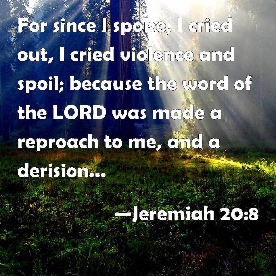 Choose a Background Jeremiah 20:8 For since I spoke, I cried out, I cried violence and spoil; because the word of the LORD was made a reproach to me, and a derision, daily. KJV: For since I spake, I cried out, I cried violence and spoil; because the word of the LORD was made a reproach unto me, and a derision, daily. DRB: For I am speaking now this long time, crying out against iniquity, and I often proclaim devistation: and the word of the Lord is made a reproach to me, and a derision all the day. DBT: For as oft as I speak, I cry out; I proclaim violence and spoil; for the word of Jehovah is become unto me a reproach and a derision all the day. ERV: For as often as I speak, I cry out; I cry, Violence and spoil: because the word of the LORD is made a reproach unto me, and a derision, all the day. WBT: For since I spoke, I cried out, I cried violence and spoil; because the word of the LORD was made a reproach to me, and a derision, daily. WEB: For as often as I speak, I cry out; I cry, Violence and destruction! because the word of Yahweh is made a reproach to me, and a derision, all the day. YLT: Because from the time I speak I cry out, 'Violence and destruction,' I cry, For the word of Jehovah hath been to me For reproach and for derision all the day.Links Jeremiah 20:8 NIV • Jeremiah 20:8 NLT • Jeremiah 20:8 ESV • Jeremiah 20:8 NASB • Jeremiah 20:8 KJV • Jeremiah 20:8 Interlinear • Jeremiah 20:8 Commentaries • Jeremiah 20:8 Parallel Texts • Jeremiah 20:8 Bible Apps • Jeremiah 20:8 Parallel • Bible Hub |