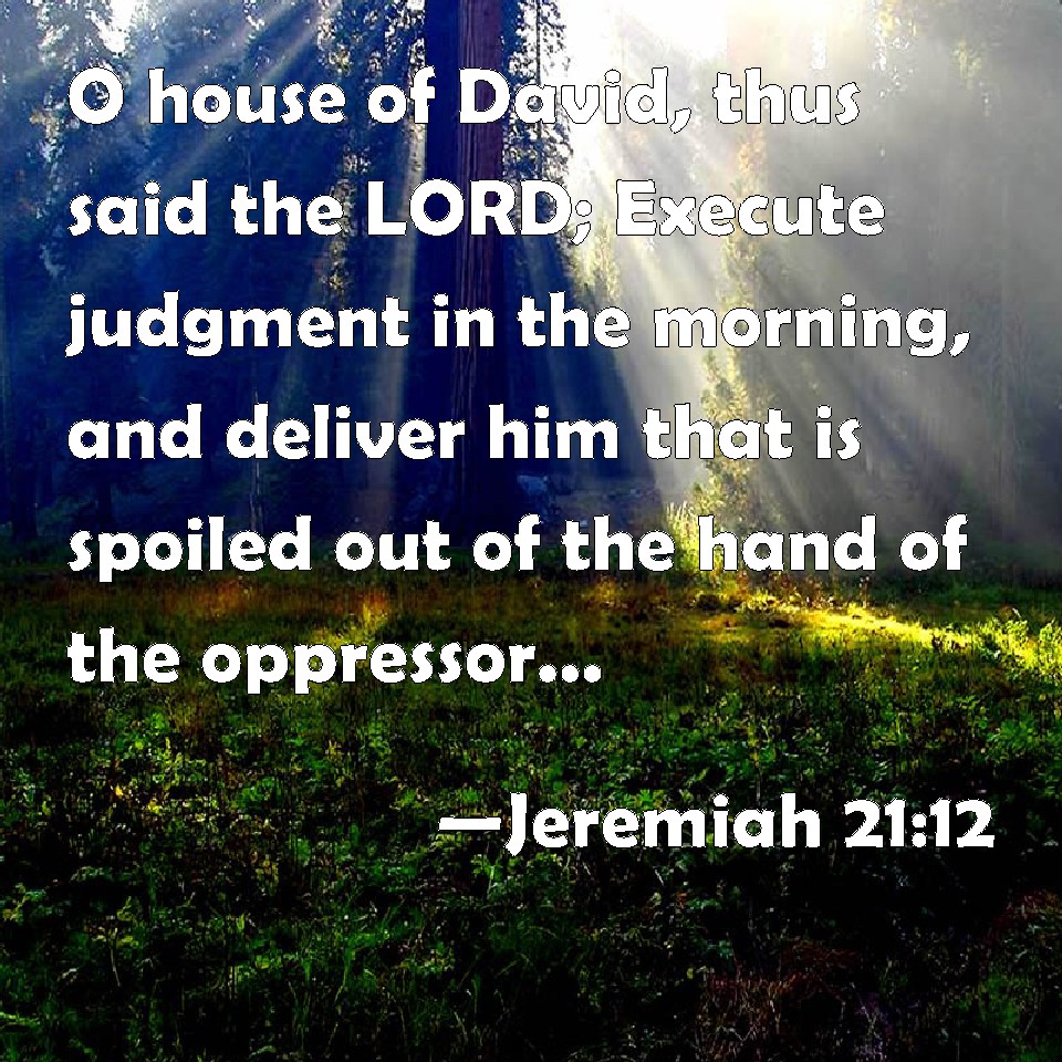 Choose a Background Jeremiah 21:12 O house of David, thus said the LORD; Execute judgment in the morning, and deliver him that is spoiled out of the hand of the oppressor, lest my fury go out like fire, and burn that none can quench it, because of the evil of your doings. KJV: O house of David, thus saith the LORD; Execute judgment in the morning, and deliver him that is spoiled out of the hand of the oppressor, lest my fury go out like fire, and burn that none can quench it, because of the evil of your doings. DRB: O house of David, this saith the Lord: Judge ye judgement in the morning, and deliver him that is oppressed by violence out of the hand of the oppressor: lest my indignation go forth like a fire, and be kindled, and there be none to quench it, because of the evil of your ways. DBT: House of David, thus saith Jehovah: Judge with justice in the morning, and deliver him that is spoiled out of the hand of the oppressor, lest my fury go forth like fire and burn, and there be none to quench it, because of the evil of your doings. ERV: O house of David, thus saith the LORD, Execute judgment in the morning, and deliver the spoiled out of the hand of the oppressor, lest my fury go forth like fire, and burn that none can quench it, because of the evil of your doings. WBT: O house of David, thus saith the LORD; Execute judgment in the morning, and deliver him that is made desolate out of the hand of the oppressor, lest my fury go out like fire, and burn that none can quench it, because of the evil of your doings. WEB: House of David, thus says Yahweh, Execute justice in the morning, and deliver him who is robbed out of the hand of the oppressor, lest my wrath go forth like fire, and burn so that none can quench it, because of the evil of your doings. YLT: O house of David, thus said Jehovah: Decide ye judgment at morning, And deliver the plundered from the hand of the oppressor, Lest My fury go forth as fire, And hath burned, and none is quenching, Because of the evil of your doings.Links Jeremiah 21:12 NIV • Jeremiah 21:12 NLT • Jeremiah 21:12 ESV • Jeremiah 21:12 NASB • Jeremiah 21:12 KJV • Jeremiah 21:12 Interlinear • Jeremiah 21:12 Commentaries • Jeremiah 21:12 Parallel Texts • Jeremiah 21:12 Bible Apps • Jeremiah 21:12 Parallel • Bible Hub |