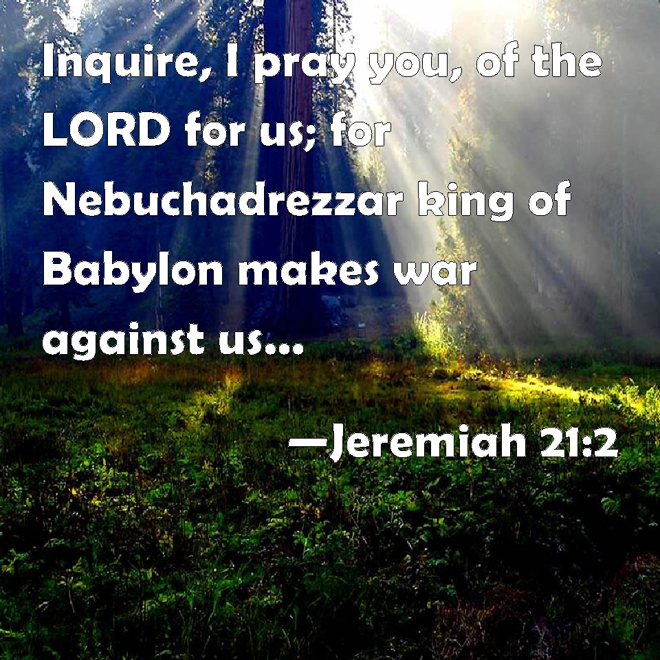 Choose a Background Jeremiah 21:2 Inquire, I pray you, of the LORD for us; for Nebuchadrezzar king of Babylon makes war against us; if so be that the LORD will deal with us according to all his wondrous works, that he may go up from us. KJV: Inquire, I pray thee, of the LORD for us; for Nebuchadrezzar king of Babylon maketh war against us; if so be that the LORD will deal with us according to all his wondrous works, that he may go up from us. DRB: Inquire of the Lord for us, for Nabuchodonosor king of Babylon maketh war against us: if so be the Lord will deal with us according to all his wonderful works, that he may depart from us. DBT: Inquire, I pray thee, of Jehovah for us; for Nebuchadrezzar the king of Babylon maketh war against us; if so be that Jehovah will deal with us according to all his marvellous works, that he may go up from us. ERV: Inquire, I pray thee, of the LORD for us; for Nebuchadrezzar king of Babylon maketh war against us: peradventure the LORD will deal with us according to all his wondrous works, that he may go up from us. WBT: Inquire, I pray thee, of the LORD for us; for Nebuchadnezzar king of Babylon maketh war against us; it may be that the LORD will deal with us according to all his wondrous works, that he may go up from us. WEB: Please inquire of Yahweh for us; for Nebuchadnezzar king of Babylon makes war against us: perhaps Yahweh will deal with us according to all his wondrous works, that he may go up from us. YLT: 'Inquire, we pray thee, for us at Jehovah, for Nebuchadrezzar king of Babylon hath fought against us; perhaps Jehovah doth deal with us according to all His wonders, and doth cause him to go up from off us.'Links Jeremiah 21:2 NIV • Jeremiah 21:2 NLT • Jeremiah 21:2 ESV • Jeremiah 21:2 NASB • Jeremiah 21:2 KJV • Jeremiah 21:2 Interlinear • Jeremiah 21:2 Commentaries • Jeremiah 21:2 Parallel Texts • Jeremiah 21:2 Bible Apps • Jeremiah 21:2 Parallel • Bible Hub |