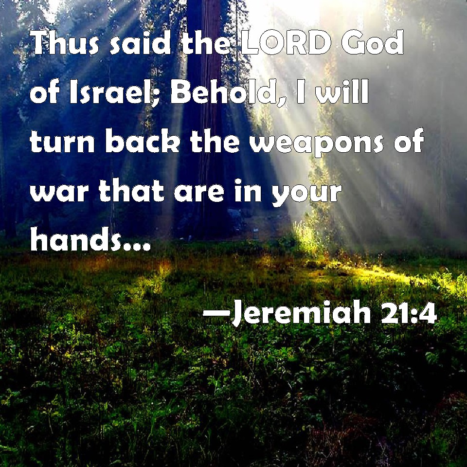 Choose a Background Jeremiah 21:4 Thus said the LORD God of Israel; Behold, I will turn back the weapons of war that are in your hands, with which you fight against the king of Babylon, and against the Chaldeans, which besiege you without the walls, and I will assemble them into the middle of this city. KJV: Thus saith the LORD God of Israel; Behold, I will turn back the weapons of war that are in your hands, wherewith ye fight against the king of Babylon, and against the Chaldeans, which besiege you without the walls, and I will assemble them into the midst of this city. DRB: Thus saith the Lord, the God of Israel: Behold I will turn back the weapons of war that are in your hands, with which you fight against the king of Babylon, and the Chaldeans, that besiege you round about the walls: and I will gather them together in the midst of this city. DBT: Thus saith Jehovah the God of Israel: Behold, I will turn back the weapons of war that are in your hands, with which ye fight against the king of Babylon, and against the Chaldeans who besiege you, outside the walls, and I will assemble them into the midst of this city. ERV: Thus saith the LORD, the God of Israel, Behold, I will turn back the weapons of war that are in your hands; wherewith ye fight against the king of Babylon, and against the Chaldeans which besiege you, without the walls, and I will gather them into the midst of this city. WBT: Thus saith the LORD God of Israel; Behold, I will turn back the weapons of war that are in your hands, with which ye fight against the king of Babylon, and against the Chaldeans, who besiege you without the walls, and I will assemble them into the midst of this city. WEB: Thus says Yahweh, the God of Israel, Behold, I will turn back the weapons of war that are in your hands, with which you fight against the king of Babylon, and against the Chaldeans who besiege you, without the walls; and I will gather them into the midst of this city. YLT: Thus said Jehovah, God of Israel: Lo, I am turning round the weapons of battle That are in your hand, With which ye do fight the king of Babylon, And the Chaldeans, who are laying siege against you, At the outside of the wall, And I have gathered them into the midst of this city,Links Jeremiah 21:4 NIV • Jeremiah 21:4 NLT • Jeremiah 21:4 ESV • Jeremiah 21:4 NASB • Jeremiah 21:4 KJV • Jeremiah 21:4 Interlinear • Jeremiah 21:4 Commentaries • Jeremiah 21:4 Parallel Texts • Jeremiah 21:4 Bible Apps • Jeremiah 21:4 Parallel • Bible Hub |