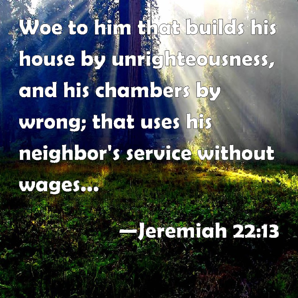 Choose a Background Jeremiah 22:13 Woe to him that builds his house by unrighteousness, and his chambers by wrong; that uses his neighbor's service without wages, and gives him not for his work; KJV: Woe unto him that buildeth his house by unrighteousness, and his chambers by wrong; that useth his neighbour's service without wages, and giveth him not for his work; DRB: Woe to him that buildeth up his house by injustice, and his chambers not in judgement: that will oppress his friend without cause, and will not pay him his wages. DBT: Woe unto him that buildeth his house by unrighteousness, and his upper chambers by injustice; that taketh his neighbour's service without wages, and giveth him not his earning; ERV: Woe unto him that buildeth his house by unrighteousness, and his chambers by injustice; that useth his neighbour's service without wages, and giveth him not his hire; WBT: Woe to him that buildeth his house by unrighteousness, and his chambers by wrong; that useth his neighbor's service without wages, and giveth him not for his work; WEB: Woe to him who builds his house by unrighteousness, and his rooms by injustice; who uses his neighbor's service without wages, and doesn't give him his hire; YLT: Woe to him who is building his house by unrighteousness, And his upper chambers by injustice, On his neighbour he layeth service for nought, And his wage he doth not give to him.Links Jeremiah 22:13 NIV • Jeremiah 22:13 NLT • Jeremiah 22:13 ESV • Jeremiah 22:13 NASB • Jeremiah 22:13 KJV • Jeremiah 22:13 Interlinear • Jeremiah 22:13 Commentaries • Jeremiah 22:13 Parallel Texts • Jeremiah 22:13 Bible Apps • Jeremiah 22:13 Parallel • Bible Hub |