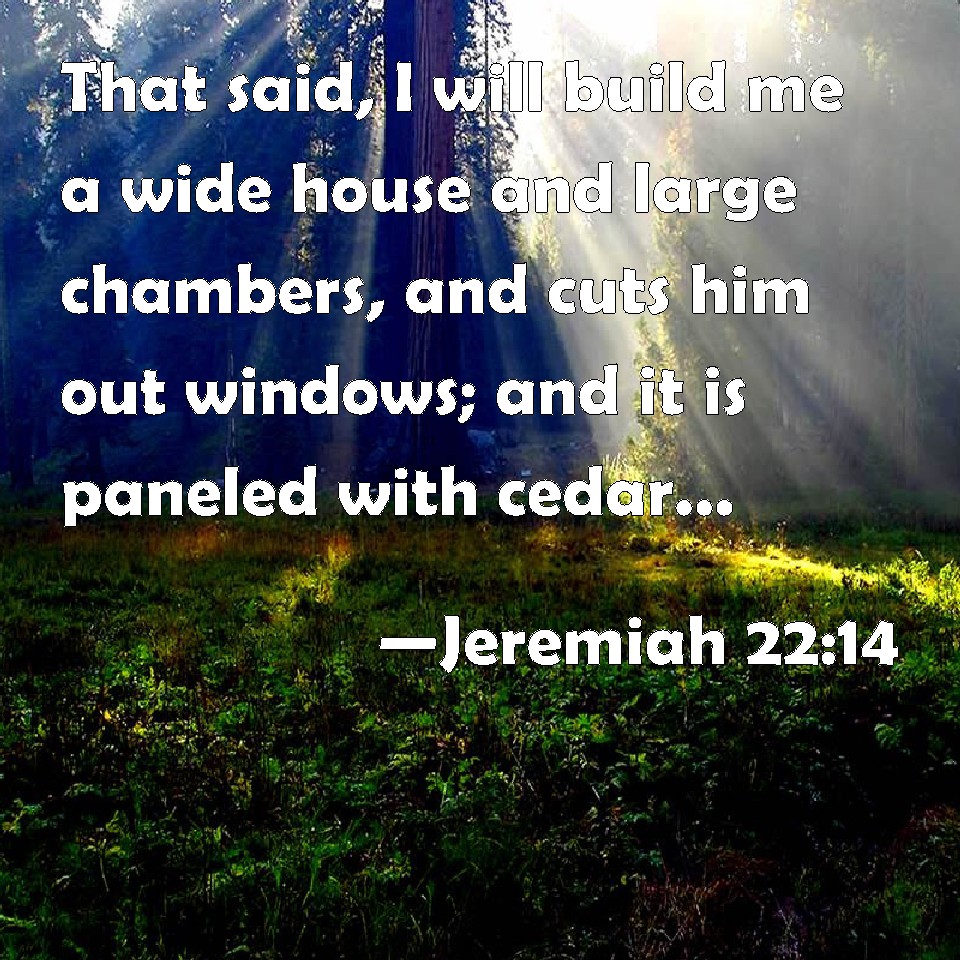 Choose a Background Jeremiah 22:14 That said, I will build me a wide house and large chambers, and cuts him out windows; and it is paneled with cedar, and painted with vermilion. KJV: That saith, I will build me a wide house and large chambers, and cutteth him out windows; and it is cieled with cedar, and painted with vermilion. DRB: Who saith: I will build me a wide house and large chambers: who openeth to himself windows, and maketh roofs of cedar, and painteth them with vermilion. DBT: that saith, I will build me a wide house, and spacious upper chambers; and he cutteth out for himself windows; and it is wainscoted with cedar, and painted with vermilion. ERV: that saith, I will build me a wide house and spacious chambers, and cutteth him out windows; and it is cieled with cedar, and painted with vermilion. WBT: That saith, I will build me a wide house and large chambers, and cutteth him out windows; and it is ceiled with cedar, and painted with vermilion. WEB: who says, I will build me a wide house and spacious rooms, and cuts him out windows; and it is ceiling with cedar, and painted with vermilion. YLT: Who is saying, 'I build for myself a large house, And airy upper chambers,' And he hath cut out for himself its windows, Ceiled with cedar, and painted with vermilion.Links Jeremiah 22:14 NIV • Jeremiah 22:14 NLT • Jeremiah 22:14 ESV • Jeremiah 22:14 NASB • Jeremiah 22:14 KJV • Jeremiah 22:14 Interlinear • Jeremiah 22:14 Commentaries • Jeremiah 22:14 Parallel Texts • Jeremiah 22:14 Bible Apps • Jeremiah 22:14 Parallel • Bible Hub |