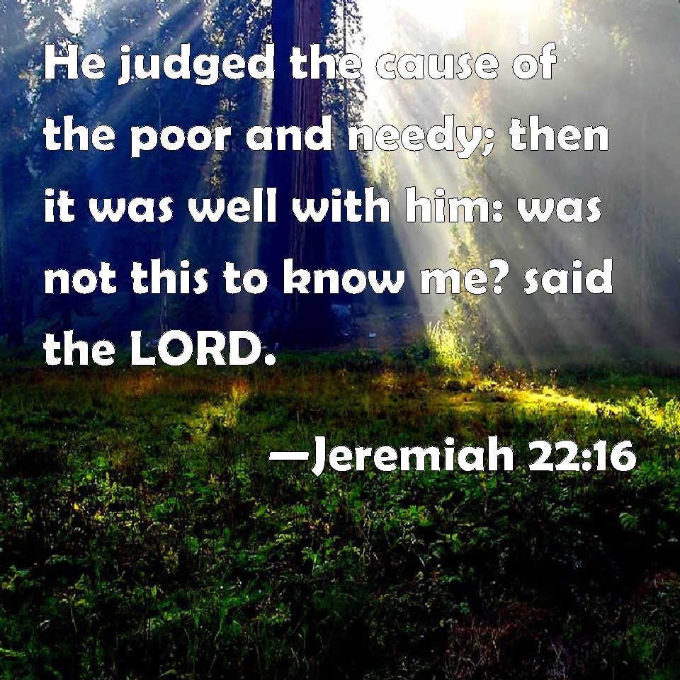 Jeremiah 22:16 He judged the cause of the poor and needy; then it was well with him: was not this to know me? said the LORD.