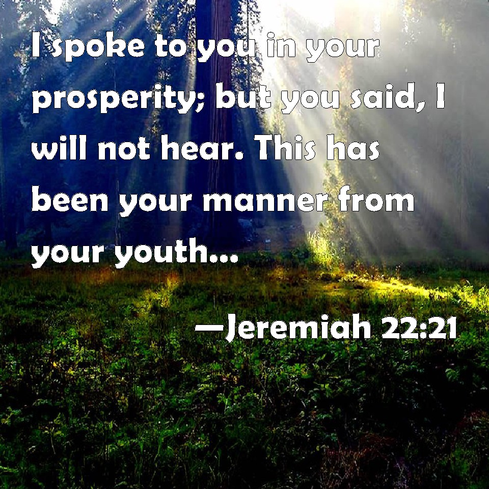 Choose a Background Jeremiah 22:21 I spoke to you in your prosperity; but you said, I will not hear. This has been your manner from your youth, that you obeyed not my voice. KJV: I spake unto thee in thy prosperity; but thou saidst, I will not hear. This hath been thy manner from thy youth, that thou obeyedst not my voice. DRB: I spoke to thee in thy properity: and thoiu saidst: I will not hear: this hath been thy way from thy youth, because thou hast not heard my voice. DBT: I spoke unto thee in thy prosperity; but thou saidst, I will not hear. This hath been thy way from thy youth, that thou hearkenedst not unto my voice. ERV: I spake unto thee in thy prosperity; but thou saidst, I will not hear. This hath been thy manner from thy youth, that thou obeyedst not my voice. WBT: I spoke to thee in thy prosperity; but thou saidest, I will not hear. This hath been thy manner from thy youth, that thou hast not obeyed my voice. WEB: I spoke to you in your prosperity; but you said, I will not hear. This has been your way from your youth, that you didn't obey my voice. YLT: I have spoken unto thee in thine ease, Thou hast said, 'I do not hearken,' This is thy way from thy youth, For thou hast not hearkened to My voice.Links Jeremiah 22:21 NIV • Jeremiah 22:21 NLT • Jeremiah 22:21 ESV • Jeremiah 22:21 NASB • Jeremiah 22:21 KJV • Jeremiah 22:21 Interlinear • Jeremiah 22:21 Commentaries • Jeremiah 22:21 Parallel Texts • Jeremiah 22:21 Bible Apps • Jeremiah 22:21 Parallel • Bible Hub |