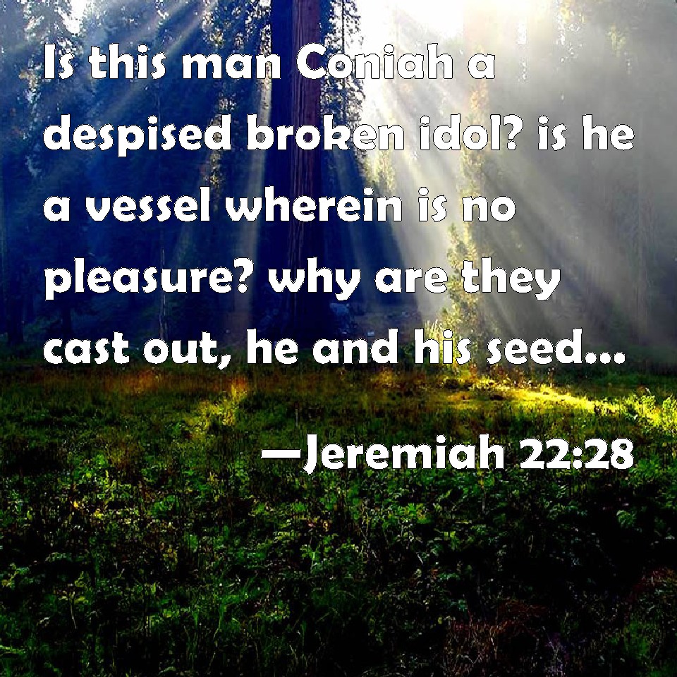 Choose a Background Jeremiah 22:28 Is this man Coniah a despised broken idol? is he a vessel wherein is no pleasure? why are they cast out, he and his seed, and are cast into a land which they know not? KJV: Is this man Coniah a despised broken idol? is he a vessel wherein is no pleasure? wherefore are they cast out, he and his seed, and are cast into a land which they know not? DRB: Is this man Jechonias an earthen and a broken vessel? is he a vessel wherein there is no pleasure? why are they cast out, he and his seed, and are cast into a land which they know not? DBT: Is this man Coniah a despised broken vase? a vessel wherein is no delight? Wherefore are they thrown out, he and his seed, and are cast into a land which they know not? ERV: Is this man Coniah a despised broken vessel? is he a vessel wherein is no pleasure? wherefore are they cast out, he and his seed, and are cast into the land which they know not? WBT: Is this man Coniah a despised broken idol? is he a vessel in which is no pleasure? why are they cast out, he and his seed, and are cast into a land which they know not? WEB: Is this man Coniah a despised broken vessel? is he a vessel in which none delights? why are they cast out, he and his seed, and are cast into the land which they don't know? YLT: A grief — a despised broken thing — is this man Coniah? A vessel in which there is no pleasure? Wherefore have they been cast up and down, He and his seed, Yea, they were cast on to a land that they knew not?Links Jeremiah 22:28 NIV • Jeremiah 22:28 NLT • Jeremiah 22:28 ESV • Jeremiah 22:28 NASB • Jeremiah 22:28 KJV • Jeremiah 22:28 Interlinear • Jeremiah 22:28 Commentaries • Jeremiah 22:28 Parallel Texts • Jeremiah 22:28 Bible Apps • Jeremiah 22:28 Parallel • Bible Hub |