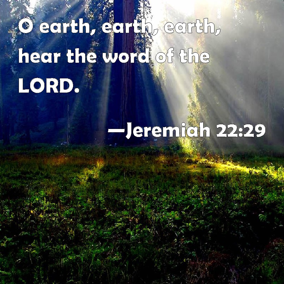 Choose a Background Jeremiah 22:29 O earth, earth, earth, hear the word of the LORD. KJV: O earth, earth, earth, hear the word of the LORD. DRB: O earth, earth, earth, hear the word of the Lord. DBT: O earth, earth, earth, hear the word of Jehovah! ERV: O earth, earth, earth, hear the word of the LORD. WBT: O earth, earth, earth, hear the word of the LORD. WEB: O earth, earth, earth, hear the word of Yahweh. YLT: Earth, earth, earth, hear a word of Jehovah,Links Jeremiah 22:29 NIV • Jeremiah 22:29 NLT • Jeremiah 22:29 ESV • Jeremiah 22:29 NASB • Jeremiah 22:29 KJV • Jeremiah 22:29 Interlinear • Jeremiah 22:29 Commentaries • Jeremiah 22:29 Parallel Texts • Jeremiah 22:29 Bible Apps • Jeremiah 22:29 Parallel • Bible Hub |