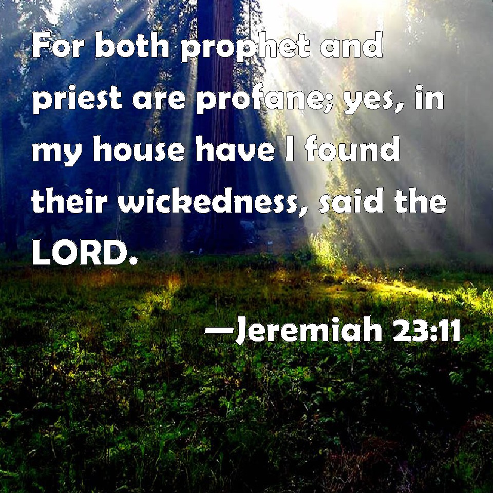 Choose a Background Jeremiah 23:11 For both prophet and priest are profane; yes, in my house have I found their wickedness, said the LORD. KJV: For both prophet and priest are profane; yea, in my house have I found their wickedness, saith the LORD. DRB: For the prophet and the priest are defiled: and in my house I have found their wickedness, saith the Lord. DBT: For both prophet and priest are profane: even in my house have I found their wickedness, saith Jehovah. ERV: for both prophet and priest are profane; yea, in my house have I found their wickedness, saith the LORD. WBT: For both prophet and priest are profane; even in my house have I found their wickedness, saith the LORD. WEB: for both prophet and priest are profane; yes, in my house have I found their wickedness, says Yahweh. YLT: For both prophet and priest have been profane, Yea, in My house I found their wickedness, An affirmation of Jehovah.Links Jeremiah 23:11 NIV • Jeremiah 23:11 NLT • Jeremiah 23:11 ESV • Jeremiah 23:11 NASB • Jeremiah 23:11 KJV • Jeremiah 23:11 Interlinear • Jeremiah 23:11 Commentaries • Jeremiah 23:11 Parallel Texts • Jeremiah 23:11 Bible Apps • Jeremiah 23:11 Parallel • Bible Hub |