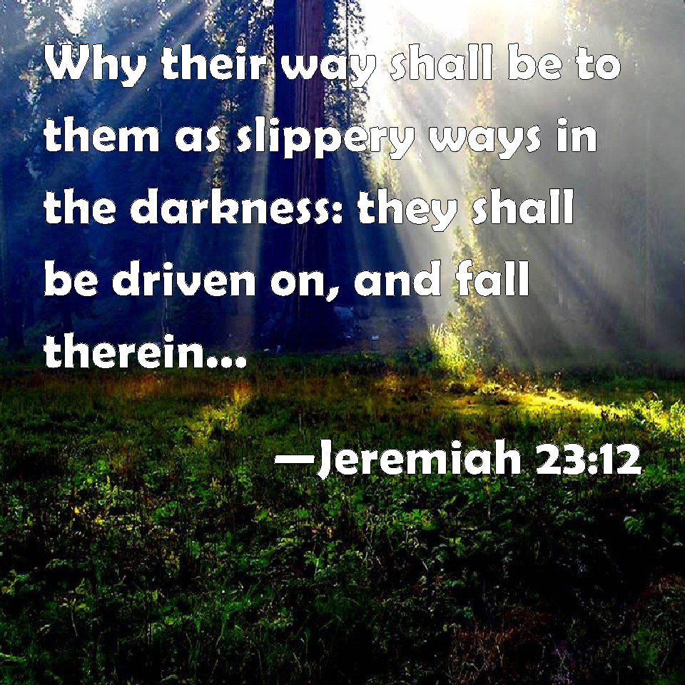 Choose a Background Jeremiah 23:12 Why their way shall be to them as slippery ways in the darkness: they shall be driven on, and fall therein: for I will bring evil on them, even the year of their visitation, said the LORD. KJV: Wherefore their way shall be unto them as slippery ways in the darkness: they shall be driven on, and fall therein: for I will bring evil upon them, even the year of their visitation, saith the LORD. DRB: Therefore their way shall be as a slippery way in the dark: for they shall be driven on, and fall therein: for I will bring evils upon them, the year of their visitation, saith the Lord. DBT: Therefore their way shall be unto them as slippery places in the darkness; they shall be driven on, and fall therein: for I will bring evil upon them in the year of their visitation, saith Jehovah. ERV: Wherefore their way shall be unto them as slippery places in the darkness: they shall be driven on, and fall therein: for I will bring evil upon them, even the year of their visitation, saith the LORD. WBT: Wherefore their way shall be to them as slippery ways in the darkness: they shall be driven on, and fall therein: for I will bring evil upon them, even the year of their visitation, saith the LORD. WEB: Therefore their way shall be to them as slippery places in the darkness: they shall be driven on, and fall therein; for I will bring evil on them, even the year of their visitation, says Yahweh. YLT: Therefore is their way to them as slippery places, Into thick darkness they are driven, And they have fallen in it, For I bring in against them evil, The year of their inspection, An affirmation of Jehovah.Links Jeremiah 23:12 NIV • Jeremiah 23:12 NLT • Jeremiah 23:12 ESV • Jeremiah 23:12 NASB • Jeremiah 23:12 KJV • Jeremiah 23:12 Interlinear • Jeremiah 23:12 Commentaries • Jeremiah 23:12 Parallel Texts • Jeremiah 23:12 Bible Apps • Jeremiah 23:12 Parallel • Bible Hub |