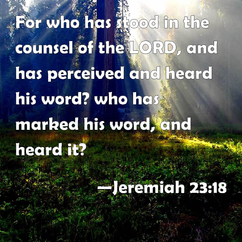 Choose a Background Jeremiah 23:18 For who has stood in the counsel of the LORD, and has perceived and heard his word? who has marked his word, and heard it? KJV: For who hath stood in the counsel of the LORD, and hath perceived and heard his word? who hath marked his word, and heard it? DRB: For who hath stood in the counsel of the Lord, and hath seen and heard his word? Who hath considered his word and heard it? DBT: For who hath stood in the council of Jehovah, so that he hath perceived and heard his word? who hath hearkened to his word and listened? ERV: For who hath stood in the council of the LORD, that he should perceive and hear his word? who hath marked my word, and heard it? WBT: For who hath stood in the counsel of the LORD, and hath perceived and heard his word? who hath marked his word, and heard it? WEB: For who has stood in the council of Yahweh, that he should perceive and hear his word? who has marked my word, and heard it? YLT: For who hath stood in the counsel of Jehovah, And seeth and heareth His word? Who hath regarded My word, and hearkeneth?Links Jeremiah 23:18 NIV • Jeremiah 23:18 NLT • Jeremiah 23:18 ESV • Jeremiah 23:18 NASB • Jeremiah 23:18 KJV • Jeremiah 23:18 Interlinear • Jeremiah 23:18 Commentaries • Jeremiah 23:18 Parallel Texts • Jeremiah 23:18 Bible Apps • Jeremiah 23:18 Parallel • Bible Hub |