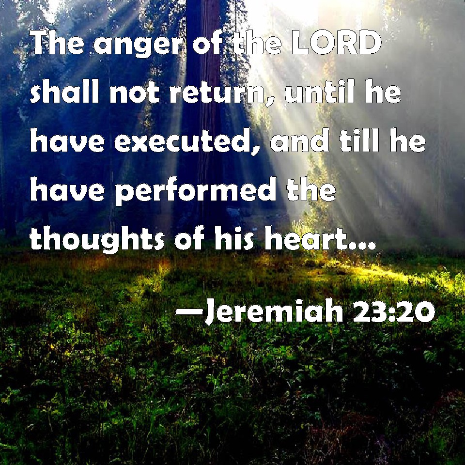 Choose a Background Jeremiah 23:20 The anger of the LORD shall not return, until he have executed, and till he have performed the thoughts of his heart: in the latter days you shall consider it perfectly. KJV: The anger of the LORD shall not return, until he have executed, and till he have performed the thoughts of his heart: in the latter days ye shall consider it perfectly. DRB: The wrath of the Lord shall not return till he execute it, and till he accomplish the thought of his heart: in the latter days you shall understand his counsel. DBT: The anger of Jehovah shall not return, until he have executed, and until he have performed the purposes of his heart: at the end of the days ye shall understand it clearly. ERV: The anger of the LORD shall not return, until he have executed, and till he have performed the intents of his heart: in the latter days ye shall understand it perfectly. WBT: The anger of the LORD shall not return, until he shall have executed, and till he shall have performed the thoughts of his heart: in the latter days ye shall consider it perfectly. WEB: The anger of Yahweh shall not return, until he has executed, and until he have performed the intents of his heart: in the latter days you shall understand it perfectly. YLT: The anger of Jehovah doth not turn back Till His doing, and till His establishing, The thoughts of His heart, In the latter end of the days ye attend to it With understanding.Links Jeremiah 23:20 NIV • Jeremiah 23:20 NLT • Jeremiah 23:20 ESV • Jeremiah 23:20 NASB • Jeremiah 23:20 KJV • Jeremiah 23:20 Interlinear • Jeremiah 23:20 Commentaries • Jeremiah 23:20 Parallel Texts • Jeremiah 23:20 Bible Apps • Jeremiah 23:20 Parallel • Bible Hub |