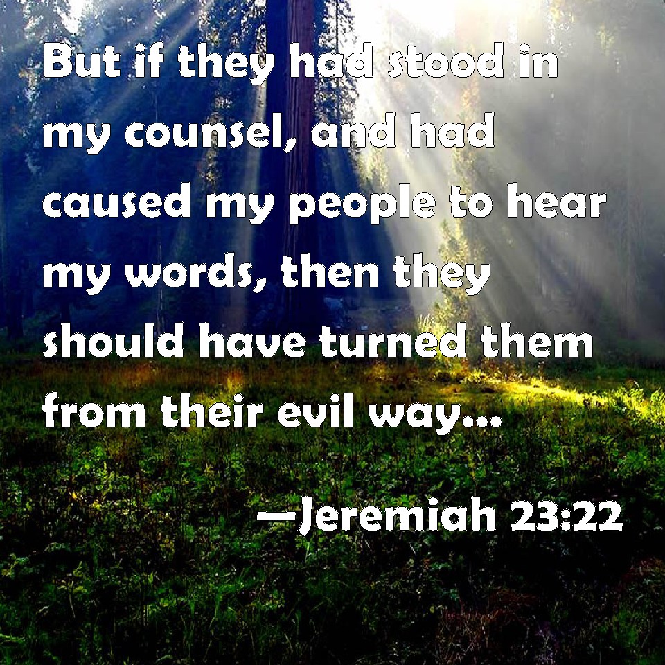 Choose a Background Jeremiah 23:22 But if they had stood in my counsel, and had caused my people to hear my words, then they should have turned them from their evil way, and from the evil of their doings. KJV: But if they had stood in my counsel, and had caused my people to hear my words, then they should have turned them from their evil way, and from the evil of their doings. DRB: If they stood in my counsel, and had made my words known to my people, I should have turned them from their evil way and from their wicked doings. DBT: But if they had stood in my council, and had caused my people to hear my words, then would they have turned them from their evil way and from the wickedness of their doings. ERV: But if they had stood in my council, then had they caused my people to hear my words, and had turned them from their evil way, and from the evil of their doings. WBT: But if they had stood in my counsel, and had caused my people to hear my words, then they would have turned them from their evil way, and from the evil of their doings. WEB: But if they had stood in my council, then had they caused my people to hear my words, and had turned them from their evil way, and from the evil of their doings. YLT: But — if they stood in My counsel, Then they cause My people to hear My words, And they turn them back from their evil way, And from the evil of their doings.Links Jeremiah 23:22 NIV • Jeremiah 23:22 NLT • Jeremiah 23:22 ESV • Jeremiah 23:22 NASB • Jeremiah 23:22 KJV • Jeremiah 23:22 Interlinear • Jeremiah 23:22 Commentaries • Jeremiah 23:22 Parallel Texts • Jeremiah 23:22 Bible Apps • Jeremiah 23:22 Parallel • Bible Hub |