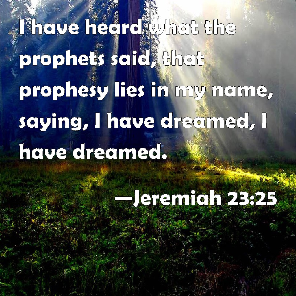 Choose a Background Jeremiah 23:25 I have heard what the prophets said, that prophesy lies in my name, saying, I have dreamed, I have dreamed. KJV: I have heard what the prophets said, that prophesy lies in my name, saying, I have dreamed, I have dreamed. DRB: I have heard what the prophets said, that prophesylies in my name, and say: I have dreamed, I have dreamed. DBT: I have heard what the prophets say, who prophesy falsehood in my name, saying, I have dreamed, I have dreamed. ERV: I have heard what the prophets have said, that prophesy lies in my name, saying, I have dreamed, I have dreamed. WBT: I have heard what the prophets said, that prophesy lies in my name, saying, I have dreamed, I have dreamed. WEB: I have heard what the prophets have said, who prophesy lies in my name, saying, I have dreamed, I have dreamed. YLT: I have heard that which the prophets said, Who prophesy in My name falsehood, saying, 'I have dreamed, I have dreamed.'Links Jeremiah 23:25 NIV • Jeremiah 23:25 NLT • Jeremiah 23:25 ESV • Jeremiah 23:25 NASB • Jeremiah 23:25 KJV • Jeremiah 23:25 Interlinear • Jeremiah 23:25 Commentaries • Jeremiah 23:25 Parallel Texts • Jeremiah 23:25 Bible Apps • Jeremiah 23:25 Parallel • Bible Hub |